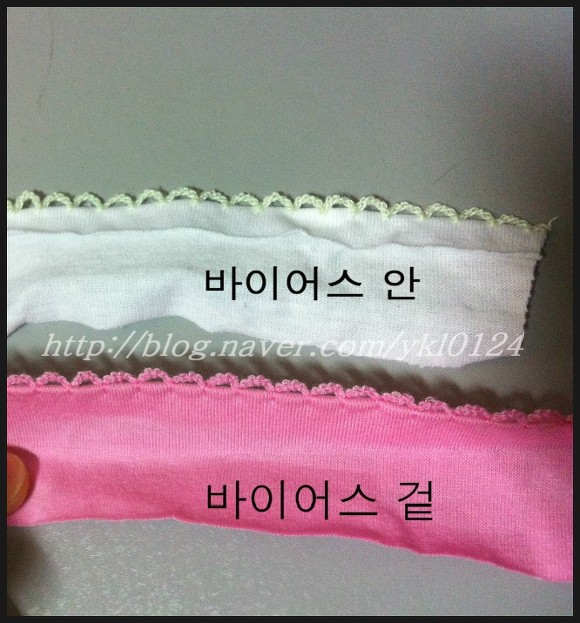 3. 바이어스 형태가 잘 잡혔으면 원단을 바이어스 사이에 넣어주세요~ 이때 주의 하실 점!! 보통 랍빠를 사용해 바이어스 할땐 원단의 겉면을 위로 향하게 하고 작업하는데요... 피콧바이어스를 사용하실땐 원단의 겉면이 바닥을 향해야 피콧부분이 원단 겉에 박힌답니다 ^^ 4. 그리고 피콧바이어스가 접히거나 말리지 않게..(특히 윗부분!! ^^) 신경 써 주시면서 살살 박으시면 끝 *^^* 그럼 이렇게 이쁘고 깔끔하게 피콧바이어스가 달아진답니다 ^^ 그럼 이웃님 모두 즐봉 해보아요~ ^^