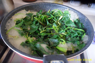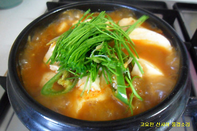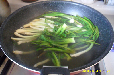 ㉢ 순두부를 넣고 끓이다 풋고추와 달래는 먹기 직전에 넣어 완성한다.
