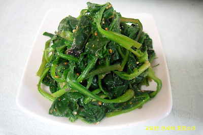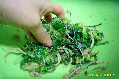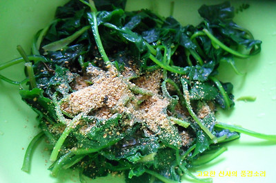 ㉡ 삶은 취나물은 양념을 넣고 조물조물 무쳐주면 완성된다.