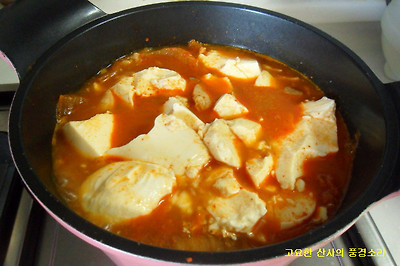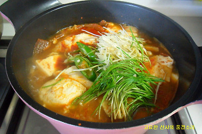 ▶ 재료 : 묵은지 1/4쪽, 돼지고기 100g, 순두부 1봉, 달래 0.5단, 풋고추 1개, 육수 3컵정도