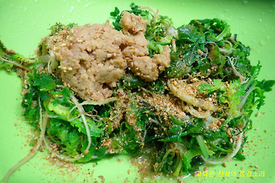 ▶ 재료 : 냉이 100g, 된장 1숟가락, 깨소금, 참기름 약간)