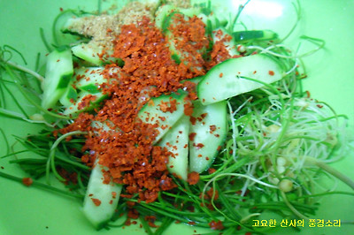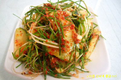 ▶ 재료 : 달래 50g(0.5단) 오이 1/2개, 고춧가루 1숟가락, 식초 1숟가락, 깨소금, 약간)
