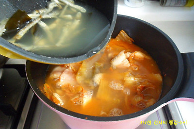 ㉡ 돼지고기가 익으면 육수를 부어준다.
