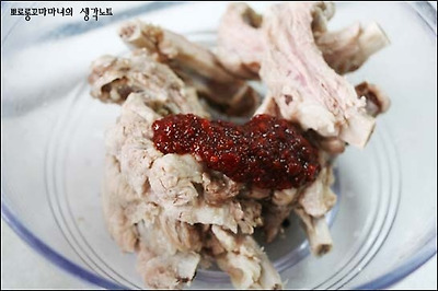 삶아진 등갈비에..고기육수 두국자 정도 넣고..양념장 2-3스푼 덜어내서..잘 버무려줍니다.