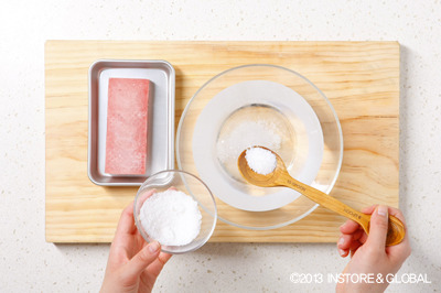 1. 미지근한 물 2컵에 소금 1큰술을 풀고 냉동 참치를 넣어 해동 한다.