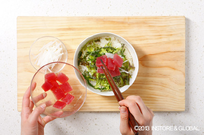8. 그릇에 밥을 담고 버무린 야채를 올리고 무채를 얹고, 참치회를 얹는다.