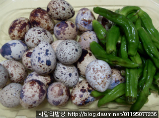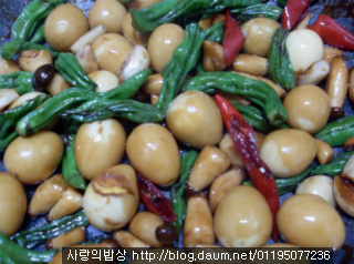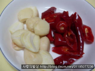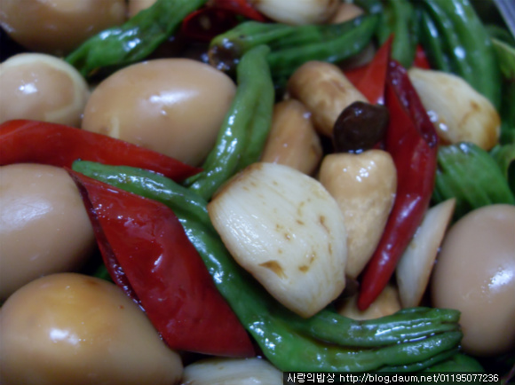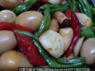 메추리알 1팩, 꼬마새송이버섯 2컵, 통마늘 6개, 꽈리고추 20개,홍고추 2개