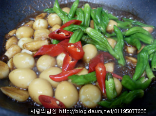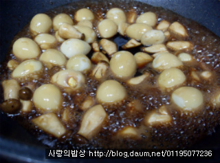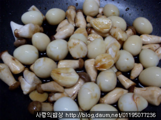 2. 양념장을 팬에 넣고 메추리알 새송이버섯 편 썬마늘을 넣고 조린다.
