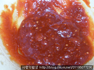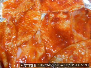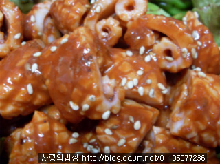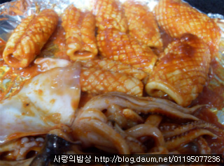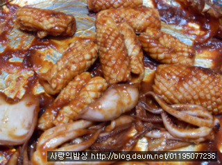 2. 위에 제시한 양념장을 넣어 잘 섞어 1의 오징어에 바른다.