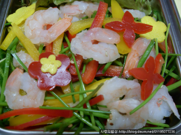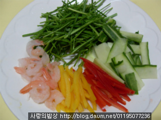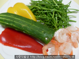 자른 영양부추 1줌, 청오이 1/2개, 파프리카, 1/3쪽씩. 칵테일 새우 10개