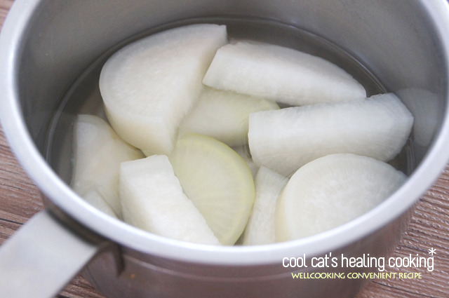 무를 그대로 넣어 조리는 것이 아니라