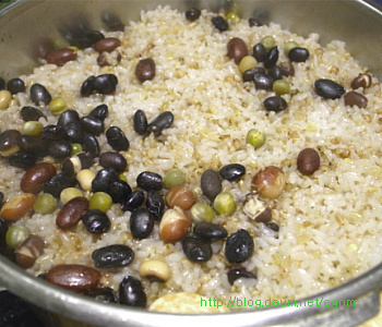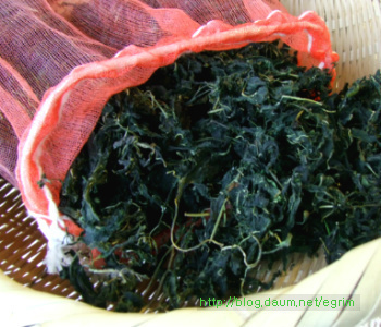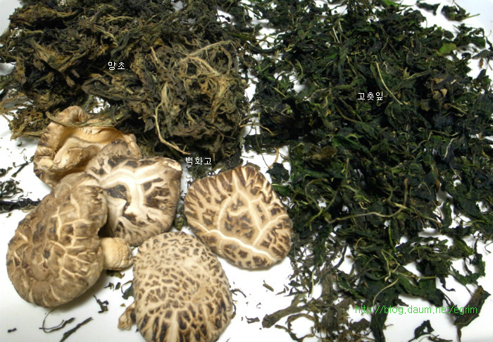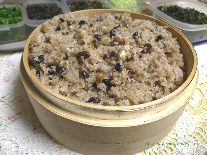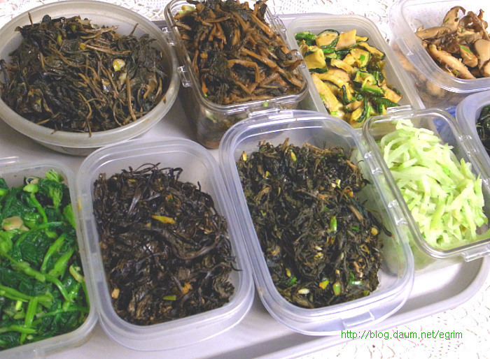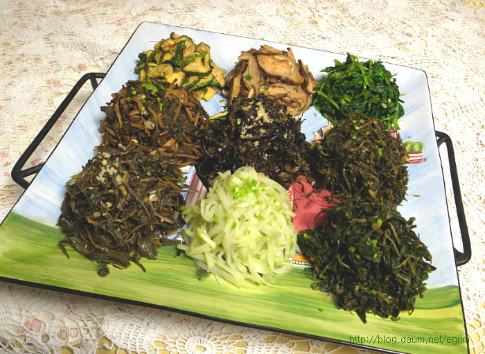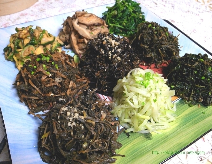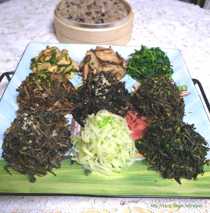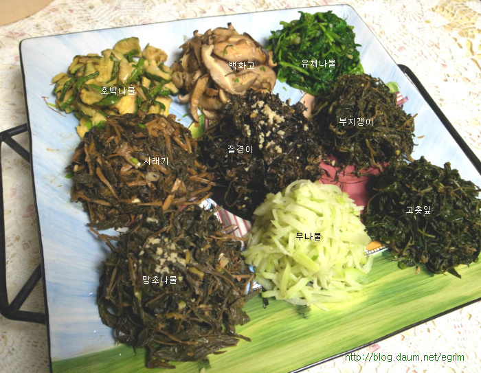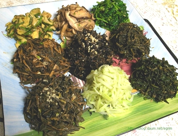 나물을 워낙 좋아해서 가을에 하나씩 말려둔 묵나물, 특별할 것 없이 평소에 먹던 것이지만 가짓수를 조금 더해서 정월대보름 나물 만들었어요. 정월 대보름나물은 우리의 건강을 지켜주는 그야말로 웰빙 식탁입니다. 오곡밥과 나물은 다음날까지 먹을 수 있도록 조금 넉넉하게 준비합니다. 대보름이 2월6일(월)이니까 그 전날 먹을 수 있도록 주말에 준비하세요~ 9가지 나물무침 오곡밥과 나물 묵나물의 깊은 맛과 향이 있는 웰빙식탁 콩이나 팥은 미리 불려서 하는데 전 압력솥에 하기 때문에 불리지 않고 했어요. 단단한 검정콩을 넣을 때는 뜸들이는 시간을 약불로 2분정도 더 해주면 밥이 고슬하니 잘 된답니다. 가을에 직접 말려둔 나물로 만들었어요. 오늘 소개하는 나물은 작년 가을에 말려둔 걸로 나물이 먹고 싶을 때 요긴하게 별미처럼 먹을 수 있습니다. 사계절 나오는 나물이지만 묵나물의 깊은 맛은 향은 즉석에서 해먹는 나물과 달라요. 집에서 직접 말리는 것들은 손질해서 말리기 때문에 깨끗하고 줄기도 부드럽고 물에 불리기만 하면 되는 멋진 반찬입니다. 그야말로 웰빙식품으로 성인병 예방 도움이 되고, 항암성분이 많이 있는게 특징입니다. 나물은 말려서 양파자루에 넣어 그늘지고 바람이 통하는 곳에 매달아 둡니다. 겨울 눈속에서도 자라나는 강인함으로 무기질, 칼슘, 인 함량이 높아 피부미용에 좋고 면역을 키워주는 사 포닌이 함유되어 항암효과가 있으며 소염, 천식 등에 효과가 있다고 합니다. 질경이 - 강인한 생명력의 질경이를 임상실험한 것을 보면 기관지염과 천식에 좋다고 합니다. 질경이를 오래 먹으면 몸이 가벼워지며 언덕을 뛰어넘을 수 있으며 무병장수할 만큼 좋은 식품입니다. 여름에 채취해서 깨끗이 씻어 삶아 말려둔 것이라 물에 5분정도 삶으면 되는 간단한 묵나물입니다. 혈관을 넓혀준다고 알려져 있습니다. 뿌리는 해열이나 진통 이뇨에 사용하며 류마치스 관절염이나 피로하여 열이날 때 좋다고 합니다. 시래기 나물 엮어 말리기 ->http://blog.daum.net/egrim/6043908 가을에 말려둔 나물 고춧잎, 애호박, 시래기, 부지갱이, 질경이, 망초, 백화고, 유채, 무나물, 취나물 등 9가지 나물을 준비했습니다. 나물 무치기 말려둔 나물은 맛과 삶는 정도가 조금씩 다르지만 거의 비슷합니다. 1. 전날 미리 물에 불려두면 다음날 삶는 시간을 절약할 수 있어요. 2. 집에서 삶아서 건조한 나물이라면 끓는물에 5분정도 약불로 삶고 불을 끄고 그 물에 잠시 담가두는 정도면 충분합니다. 단, 시래기 나물은 시간을 조금 더 잡고 호박나물은 삶지 않고 물에 불리기만 하세요. 3. 삶은 나물은 물기를 살짝만 짜서 냄비에 넣고 5분정도 볶아 줍니다. 양념은 나물마다 조금씩 다르지만 일단 들기름, 파, 마늘을 기본으로 하고, * 소금이나 국간장으로 간을 하거나 고추장을 조금씩(반숟갈) 넣어도 맛있어요. 저는 거의 모든 나물에 고추장을 조금씩 넣어 주었어요. * 나물을 볶을 때는 마늘을 안넣어야 나물 본래의 맛을 즐길 수 있지만 전 취향대로 마늘을 넣었어요. 그리고 들기름을 넉넉하게 넣어 주면 정말 나물의 맛과 참 잘 어우러져 묵나물 특유의 향과 맛을 느낄 수 있습니다. 부럼깨물기, 더위팔기, 귀밝이술 마시기 등은 어렸을적의 추억이 오래도록 남아 있습니다. 아이들이 있는 가정에서는 이런 절기를 챙기시면 어떨까요. 호두 몇알과 나물 두어만으로도 추억은 충분합니다. 양파자루에 매달아둔 나물들이 조금씩 줄어들면 따뜻한 봄이 옵니다. 얼마남지 않은 묵나물을 보면서 나의 봄을 그려봅니다. 1. 원추리초무침 ▶ 재료 : 원추리 100g, 고추장 1숟가락, 식초 2숟가락, 깨소금, 참기름 약간 ▶ 만드는 순서 ㉠ 끓는 물에 원추리를 살짝 데쳐준다. ㉡ 먹기 좋은 크기로 썰어 조물조물 무쳐주면 완성된다. 2. 취나물 ▶ 재료 : 취나물 150g, 간장 1.5숟가락, 깨소금, 참기름 약간 ▶ 만드는 순서 ㉠ 취나물은 손질하여 끓는 물에 데쳐낸다. ㉡ 먹기 좋은 크기로 썰어 조물조물 무쳐주면 완성된다. 3. 냉이 된장무침 ▶ 재료 : 냉이 150g, 된장 1숟가락, 깨소금, 참기름 약간 ▶ 만드는 순서 ㉠ 냉이는 깨끗하게 손질한다. ㉡ 끓는 물에 살짝 데쳐낸다. ㉢ 먹기 좋은 크기로 썰어 된장과 양념을 넣고 조물조물 무쳐주면 완성된다. 4. 톳나물 ▶ 재료 : 톳 100g, 간장 1숟가락, 깨소금, 참기름 약간 ▶ 만드는 순서 ㉠ 톳은 이물질을 제거해 둔다. ㉡ 끓는 물에 살짝 데쳐준다. 색이 변하면 바로 들어낸다. ㉢ 간장, 깨소금, 참기름을 넣고 조물조물 무쳐주면 완성된다. 5. 콩나물 새송이무침 ▶ 재료 : 콩나물 100g, 새송이버섯 2개, 간장 2숟가락, 깨소금, 참기름 약간 ▶ 만드는 순서 ㉠ 콩나물을 깨끗하게 씻어둔다. ㉡ 새송이버섯은 곱게 채 썰어둔다. ㉢ 약간의 물을 붓고 콩나물과 새송이를 넣고 삶아낸다. ㉣ 삶아낸 콩나물과 새송이에 양념을 넣고 조물조물 무쳐주면 완성된다. 6. 무 달래 생채 ▶ 재료 : 무 1/4개, 달래 약간 고춧가루 2숟가락, 간장 1숟가락, 식초 2숟가락, 깨소금, 참기름, 소금 약간 ▶ 만드는 순서 ㉠ 무는 곱게 채 썰고 달래는 손질하여 먹기 좋은 크기로 썰어둔다. ㉡ 곱게 채 썬 무에 양념을 넣고 조물조