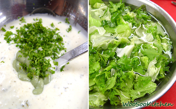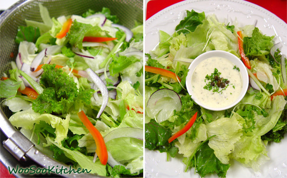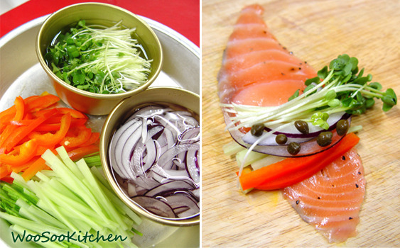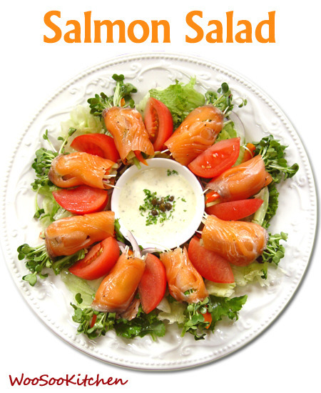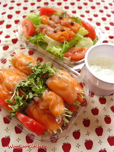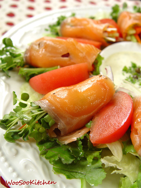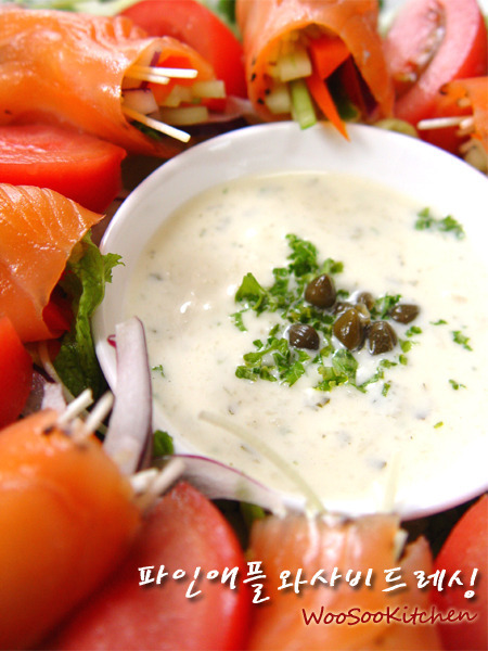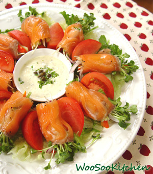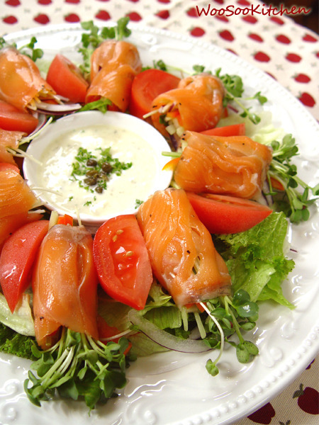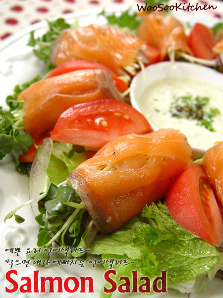 | tip 연어는 스테이크용이 아닌 훈제한 연어슬라이스를 사용하시는게 좋답니다. 스테이크용으로 나온 연어는 구워서 야채와 함께 곁들인 샐러드로 만들어드셔요. 드레싱은 입맛에 따라 이탈리안 드레싱이나 과일드레싱, 홀스레디쉬를 곁들인 샤워크림소스등 고소하면서 상큼한 맛으로 골라 만들어주시면 좋아요. 간단히 시판되는 여러 드레싱 제품들을 사용하셔도 좋지만 과일(파인애플,복숭아,키위,포도등)을 갈아서 요거트에 믹싱만 해도 맛있는 드레싱을 드실수 있답니다. 연어는 양파와 무순, 양상추등 아삭하면서 약간 매콤한 야채와도 아주 잘 어울린답니다. 주홍빛 속살 고운 연어가 우리에게 친숙해진것은 얼마되지 않는듯해요. 주로 서양의 생선요리에 많이 쓰이던 연어가 영양의 가치와 맛, 유통의 자유로움등으로 우리에게도 사랑받는 물고기가 되었네요. 연어는 잡힌 후 급냉처리해서 들어와 익혀서 주로 먹는 스테이크용과 훈제를 해서 연어로 많이 만날수가 있답니다. 날연어는 초밥이나 회로도 먹긴 하지만 훈제연어가 더 풍미가 있는듯해요. 손으로 만지면 그대로 미끌한 기름이 뭍어날정도로 아주 기름진 연어는 생선기름 성분이 풍부한 오메가3 지방산이 풍부해 심장병예방효과와 혈액순환에 좋다고 합니다. 칼슘과 비타민D 또한 풍부해 뼈건강에도 좋은 연어는 고운 붉은 주홍빛 속살을 보여주는 성분이 항산화효과가 뛰어나 노화방지와 주름개선등 피부미용에도 아주 좋아 화장품원료로도 사용된다고하네요. 연어의 예쁜 속살을 먹으면 예뻐진다는? ㅋㅋㅋ 해수면 근처에 사는 연어는 중금속 논란속에 있는 물고기이기도해서 면역력이 약한 임산부나 어린이는 섭취를 많이 하지 않는것을 권유하기도 한답니다. 그만큼 우리가 매일 연어를 섭취하는건 아니니 걱정하진 않으셔도 될듯해요^^ 손님초대에도, 와인파티에도, 예쁘게 내어놓을 수 있는 연어롤쌈 샐러드 레시피를 올려드릴께요~ * 재 료 * 훈제연어슬라이스 250g,양상추1/4통,치커리등 샐러등용 야채(쌈용)약간,토마토1개 양파1/2개,파프리카1/2개,오이1/4개,무순1팩, 케이퍼2스푼 -파인애플와사비드레싱:파인애플(캔슬라이스)2조각,마요네즈4스푼,레몬즙1스푼, 식초1/2스푼,꿀1스푼,다진파슬리약간,와사비1/2스푼,소금약간 샐러드용 야채는 입맛과 상황에 따라 준비해도 좋으며 드레싱은 새콤달콤하며 와사비를 넣어 살짝 매콤한 맛이 포인트랍니다. 식초와 꿀, 설탕등을 이용해 맛을 맞춰주시고 레몬즙은 없으면 생략하셔도 좋아요. 파인애플캔의 쥬스는 버리지 말고 넣어서 농도를 흐를정도로 맞춰주고 소금간을 해주셔야 야채와 함께 드셨을때 간이 맞는답니다. 마요네즈 대신에 요거트를 넣어주셔도 칼로리가 낮아져 좋답니다. 1. 파인애플은 믹서기에 곱게 갈아 믹싱볼에 넣고 분량의 드레싱재료들을 모두 넣어 잘 섞어준다. (입맛에 따라 매콤한 와사비의 양을 가감해주고 식초와 꿀,설탕으로 맛을 맞춰준다 와사비의 매콤한 맛이 싫다면 다진 양파와 피클을 넣어준다) 2. 양상추와 잎야채는 한입크기정도로 손으로 찢어서 찬물에 담가놓는다. (샐러드에 들어가는 야채는 칼로 자르지 않고 꼭 손으로 찢어주어야 영양손실도 적고 색이 변하지 않는다) 3. 오이는 돌려깍기를 해서 파프리카,양파와 함께 곱게 채썰어준다. 무순은 밑둥을 살짝 잘라내고 찬물에 살짝 담가서 준비한다. (채썬 양파도 찬물에 살짝 담가놓아야 매운맛이 빠지고 아삭아삭 맛있다) 4. 연어위에 오이와 파프리카, 양파, 무순, 케이퍼를 올려 김밥말듯 말아준다. (얇게 썰어진 연어슬라이스는 찢어지기 쉬우니 조심스럽게 떼어 말아준다) 돌돌 말아놓은 연어롤은 넓은 쟁반이나 그릇에 담아두고 말기 힘든 작은 연어슬라이스는 야채를 빼고 말아서 준비해놓는다. 5. 찬물에 담가두었던 야채는 체반에 받혀 물기를 털어내주고 연어롤에 쓰고 남았던 야채를 넣어 섞어준다. 6. 원형접시에 야채를 바닥에 골고루 깔아주고 가운데 드레싱을 담은 작은 볼을 올린다. (드레싱은 따로 식탁에 내어주어도 좋고 접시의 모양에 따라 여유분을 남기고 야채샐러드를 담아내준다) 7. 마지막으로 연어롤쌈과 토마토를 보기좋게 올려담아 완성한다. 보기에도 꽃처럼 예쁘고 고운 연어롤쌈 샐러드랍니다. 손님초대를 하실때는 연어롤을 미리 말아 냉장고에 넣어두셨다가 다른요리와 함께 세팅하기 직전 꺼내 담아주시면 좋답니다. 기름진 훈제연어는 아삭아삭 신선한 채소와 함께 드시면 느끼하지 않고 아주 맛있게 드실 수 있답니다. 케이퍼의 독특한 향은 연어와 잘 어울려 향도 맛도 더 빛내주는듯 해요. 부드럽고 상큼한 파인애플드레싱에 와사비를 넣어 살짝 매콤해졌답니다. 고추냉이 특유의 매콤하고 싸한~~맛은 연어의 비릿한 맛을 없애주고 감칠맛을 더욱 풍부하게 해준답니다~ 신선한 채소와 특유의 고소한 풍미 가득한 연어^**^ 더운 여름엔 냉장고에 넣어두셨던 시원한 샴폐인과 곁들여 드셔도 환상적이랍니다~ 친구들과의 편안한 홈파티를 생각하신다면 ㅋㅋㅋ 이렇게 포장해서 선물로 가져가셔도 참 좋답니다~~~Let's go Party!!! 흔히 먹는 다른 물고기들과는 달리 저렴하지 않는 
