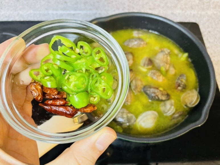 매콤한 맛을 위해 페퍼론치노 5개와 청양고추 1개를 넣고 끓여주세요