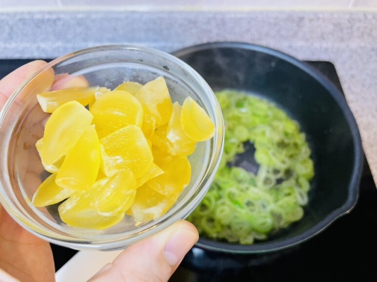 파기름을 내준 후 마늘 한 줌을 편 썰어서 넣고 볶아주세요~