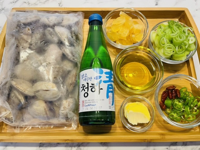 바지락700~800g/청하(청주), 올리브유3T/파한컵/버터1T/청양고추1개, 설탕0.5t/소금