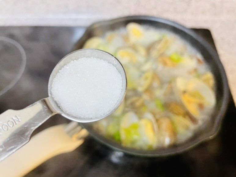 바지락이 입을 다 벌리면 감칠맛을 추가해주기 위해 설탕 0.5 티스푼과 소금 1/3 티스푼을 넣어 간을 해준 후