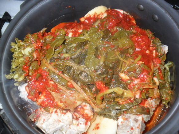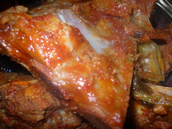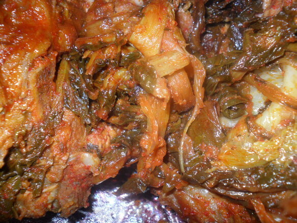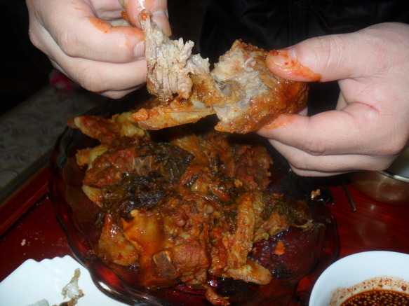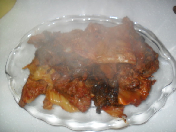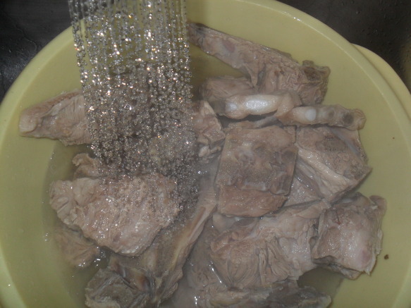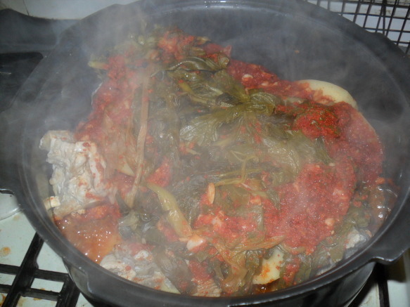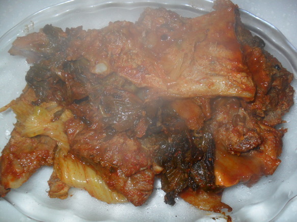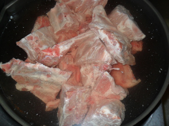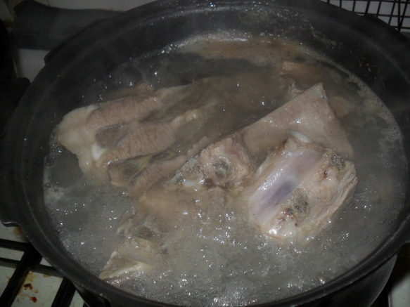| 돼지등뼈 시레기 찜 만들기 돼지등뼈을 가지고 뼈찜을 함 만들어 봤어요 식구4명정도는 충분이 먹을수 있는 양이죠~ 재료:돼지등뼈,시래기,감자,고추장,간장,매실액기스,맛술,후추, 월계수잎,맥주,녹차,마늘,생강가루,설탕등등 먼저등뼈을 물에 넣어 핏물을 빼고~ 1시간정도 핏물을~~담가놓아요~ 물을 끓여 월계수잎,생강,소주을 넣어~ 팔팔 물이 끓으면 뼈을 넣고 ~ 분비물이 많이 나오네요~~~ 어느정도 물을 끓여 분비물을 빼어~물에 씻어 놉니다~ 감자와 등뼈을 넣고~~ 시래기도 넣고~ 소스입니다...맥주와 녹차가 들어 갑니다.. 소스을 솥에~넣고~ 불을 올려 천천이 조려냅니다. 40분이상 약한불로 조려 냅니다.. 거의완성이네요~ 맛이 정말 매워요~ 땀나네요~ 기름기가 많이 빠져서 감칠나요~ 시래기 맛도 훌륭하구요~ 시장에가면 특별이 할수있는 요리가 많지는 않죠~ 매꼽하고 푸짐하게 할수있는 맛나는 등뼈찜 입니다... |