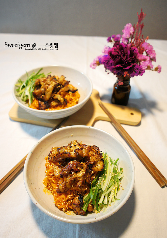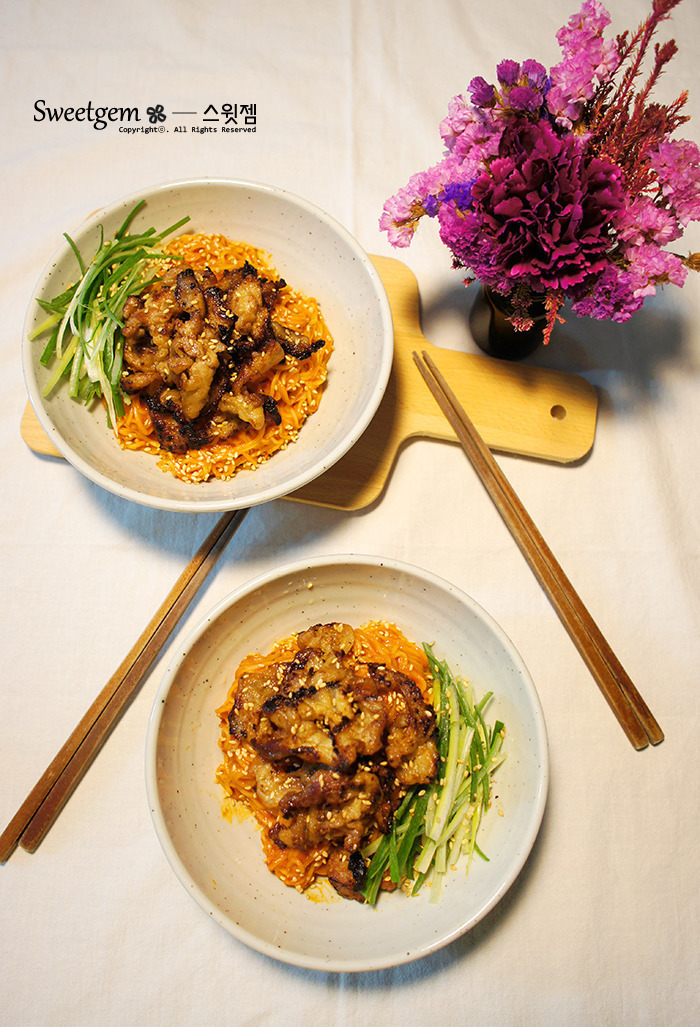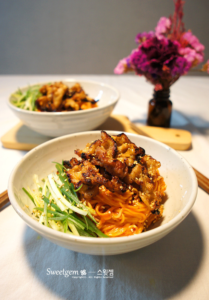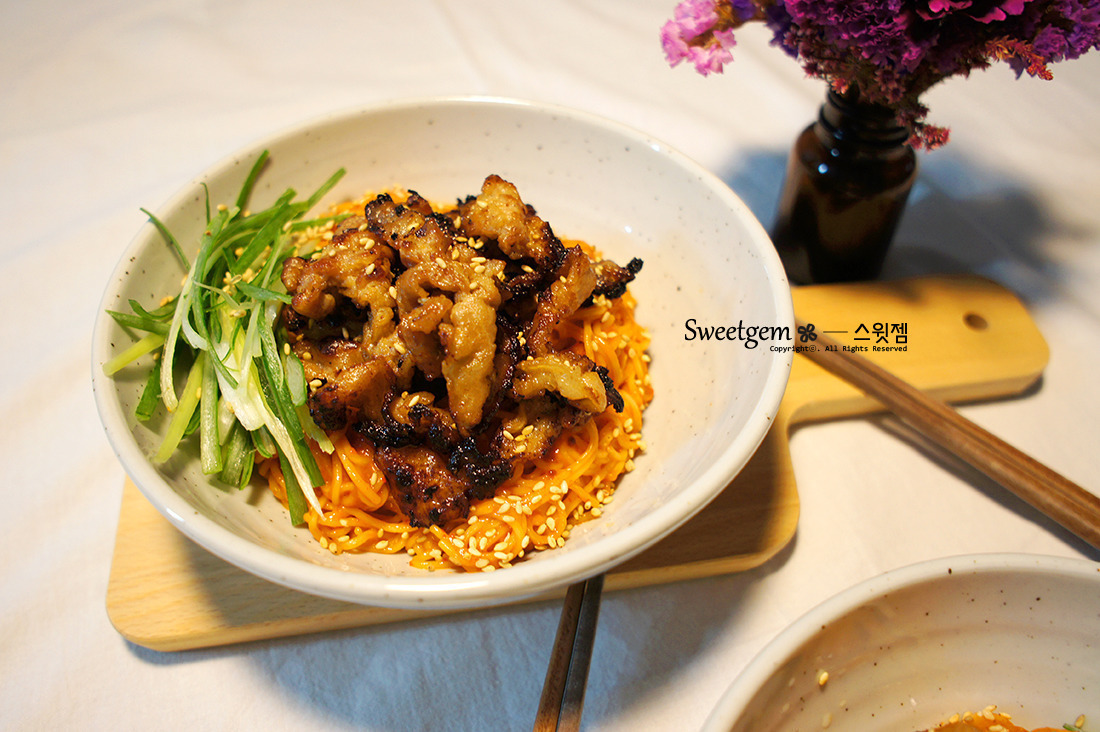 | 대패삼겹살 비빔국수 만들기 대패삼겹살을 바싹구워 올린 비빔국수입니다. 먼저 생대패삼겹살에 양념을 해줍니다. 250g정도에 조선간장 2.5~3수저, 올리고당 1수저, 청주 2수저, 다진마늘 1수저 조물조물 섞어주고, 재워두는 시간은 따로 필요없이 바로 구워줍니다. 대패삼겹살을 바싹 구워준뒤 키친타올위에 올려서 기름기를 빼주세요. 대파를 흰부분 초록부분 섞어서 채썰어 주었어요. 보통 흰부분은 향신료로, 초록부분은 장식용으로 쓰는데, 파의 향이나 맛이 너무 강한게 싫으시다면 흰부분은 아주 얇게 썰어서 물에 담가두었다가 사용하세요~ 국수는 소면으로 2인분 삶아주시구요. 찬물에 씻어둡니다. 양념은 고춧가루 2수저, 다진마늘 반티스푼, 쯔유 2수저, 올리고당 1수저, 매실청 1수저, 고추장 소복히 2수저, 참기름 2~3수저로 비벼줍니다. 대패삼겹살 바싹구우니 고소하고 맛있어요. 가볍게 한끼하기 좋았습니다. |