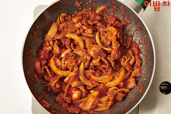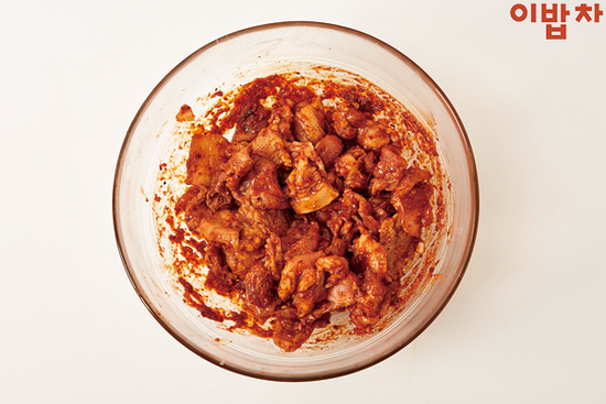 1. 돼지고기는 양념장에 버무려 10분간 재우고,