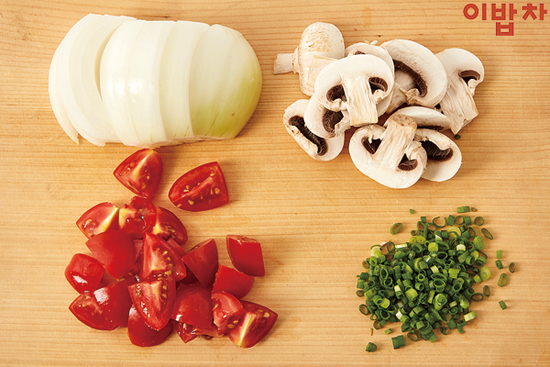 양파(½개), 양송이버섯(3개), 방울토마토(6개), 쪽파(1대), 피자치즈(1컵)