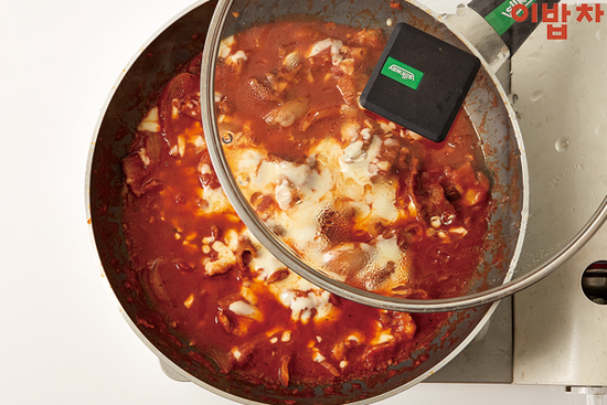 5분간 끓인 뒤 피자치즈를 얹어 녹이고,