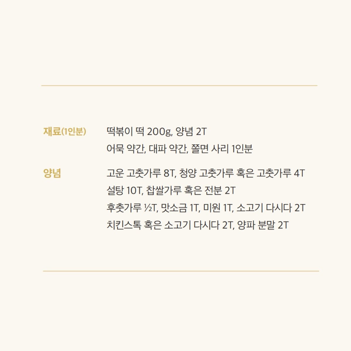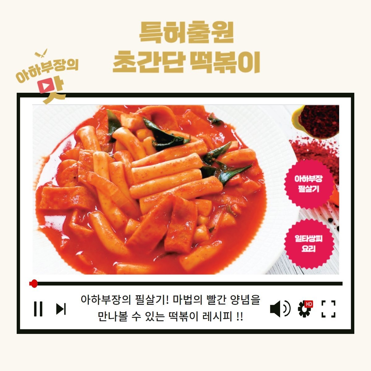 | 《아하부장의 맛》#1 특허출원 초간단 떡볶이 레시피 대공개! 아하부장의 필살기, ‘마법의 빨간 양념’을 만나볼 수 있는 레시피입니다! 이 양념만 있다면 특별한 재료 없이도 떡볶이를 라면보다 쉽게, 유명 떡볶이 전문점보다 더 맛있게 만들 수 있습니다. 재료 레시피 넉넉하게 만들어 닭볶음탕, 제육볶음 등 다양한 요리에 활용해보세요. ● 입자가 곱고 색깔이 예쁜 태양초 고춧가루를 사용하면 요리의 완성도가 높아집니다. ● 물의 양에 따라 국물 떡볶이로도, 자작한 떡볶이로도 즐길 수 있으니 취향에 따라 요리해보세요. ※ 오늘의 레시피는 유튜브 조회순으로 뽑은아하부장 인기 요리 TOP 100 《아하부장의 맛》을 발췌해 제작했습니다. |