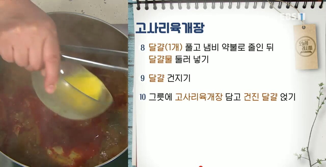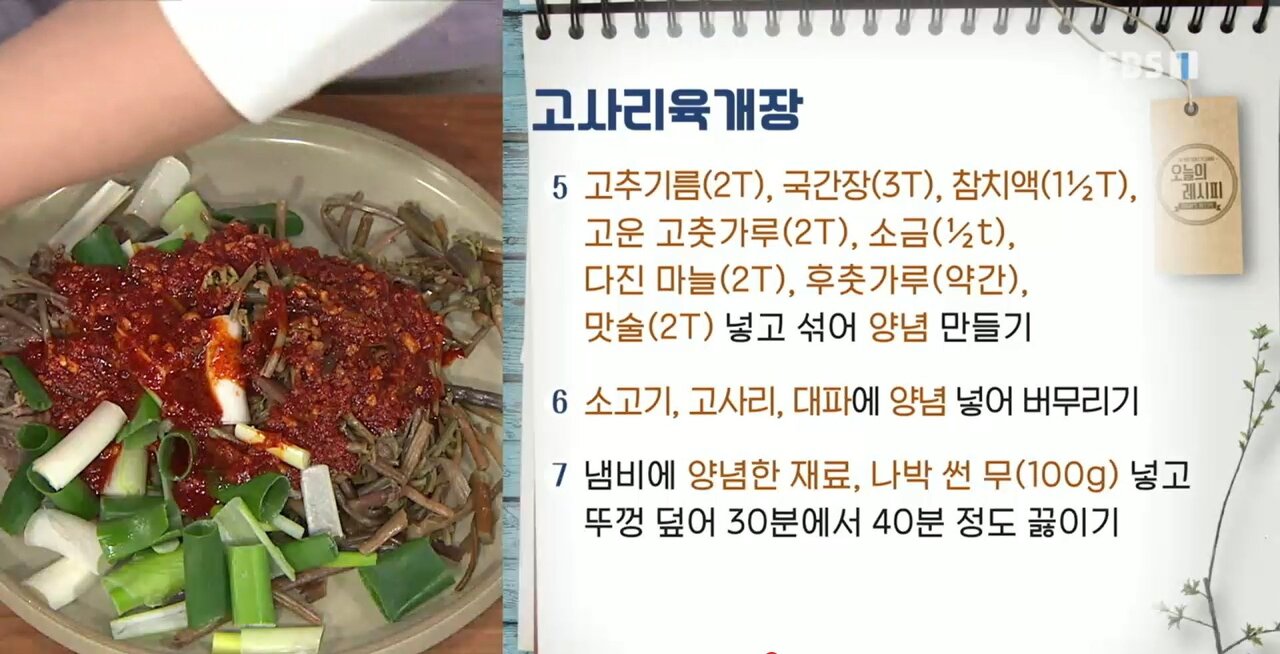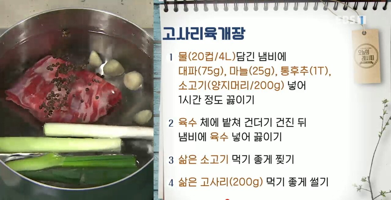 고사리육개장, 쉬운 레시피 공유! 육개장은 요리하기 어렵다? NO! 집에서도 쉽게 만들 수 있는 얼큰한 고사리 육개장 레시피를 공유합니다~ ■ 주재료: 소고기(양지머리/200g), 물(20컵/4L), 마늘(25g), 통후추(1T), 대파(75g), 달걀(1개), 삶은 고사리(200g), 먹기 좋게 썬 대파(65g), 나박 썬 무(100g) ■ 양념 재료: 후춧가루(약간), 맛술(2T), 국간장(3T), 고운 고춧가루(2T), 소금(½t), 참치액(1½T), 다진 마늘(2T), 고추기름(2T) ■ 요리 순서 1. 물(20컵/4L)담긴 냄비에 대파(75g), 마늘(25g), 통후추(1T), 소고기(양지머리/200g) 넣어 1시간 정도 끓이기 ✔ 소고기의 핏물은 물에 씻어 키친타월로 물기를 제거해 주세요. 2. 육수 체에 밭쳐 건더기 건진 뒤 냄비에 육수 넣어 끓이기 ✔ 육수는 기름기를 제거한 뒤 냄비에 넣어 주세요. 3. 삶은 소고기 먹기 좋게 찢기 4. 삶은 고사리(200g) 먹기 좋게 썰기 5. 고추기름(2T), 국간장(3T), 참치액(1½T), 고운 고춧가루(2T), 소금(½t), 다진 마늘(2T), 후춧가루(약간), 맛술(2T) 넣고 섞어 양념 만들기 ✔ 양념을 숙성시키면 고춧가루 색이 진해져 더욱 먹음직스러워요. 6. 소고기에 고사리, 대파에 양념 넣어 버무리기 7. 냄비에 양념한 재료, 나박 썬 무(100g) 넣고 뚜껑 덮어 30분에서 40분 정도 끓이기 ✔ 고사리육개장은 10분 정도 센 불에 끓이다가 끓기 시작하면 중불에서 20분 정도 끓여 주세요. 8. 달걀(1개) 풀고 냄비 약불로 줄인 뒤 달걀물 둘러 넣기 9. 달걀 건지기 10. 그릇에 고사리육개장 담고 건진 달걀 얹기 선미자 요리연구가(‘ㅅ’대학교 보건대학원 최고위과정 수료, 저서 <선미자의 맛> 외 다수)님의 레시피입니다. |