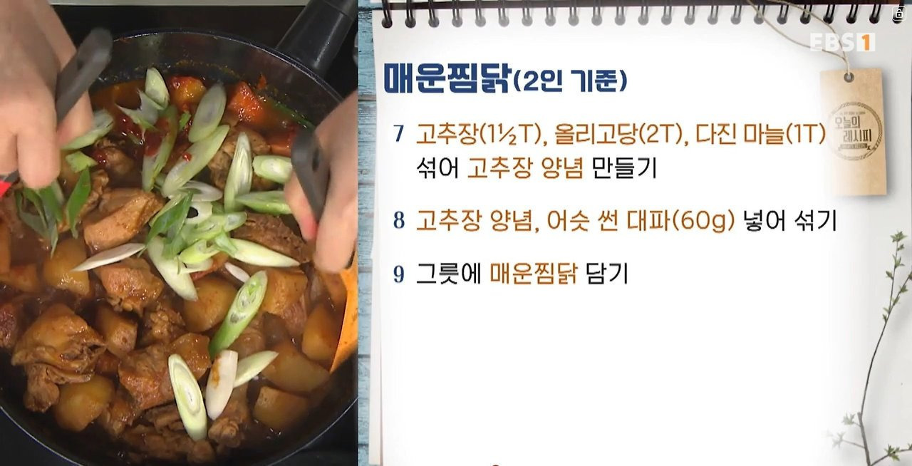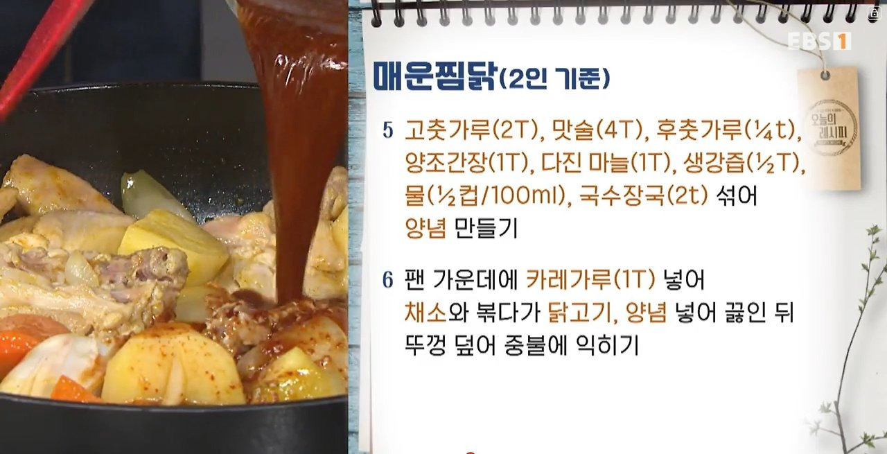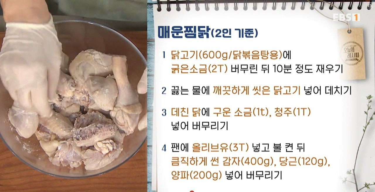 실패 확률 제로! 매운찜닭 레시피 찜닭 요리하기 어렵다고? No! 이 레시피대로 따라 하면 실패할 확률은 Zero! 맛부터 비주얼까지 완벽한 매운찜닭 레시피를 소개합니다~ ■ 주재료: 닭고기(600g/닭볶음탕용), 굵은소금(2T), 구운 소금(1t), 청주(1T), 올리브유(3T), 감자(400g), 당근(120g), 양파(200g), 대파(60g) ■ 양념재료: 고춧가루(2T), 맛술(4T), 후춧가루(¼t), 양조간장(1T), 다진 마늘(1T), 생강즙(½T), 물(½컵/100ml), 국수장국(2t), 카레가루(1T), 고추장(1½T), 올리고당(2T), 다진 마늘(1T) ■ 요리 순서 1. 닭고기(600g/닭볶음탕용)에 굵은소금(2T) 버무린 뒤 10분 정도 재우기 ✔ 닭고기에 굵은소금을 버무려 10분 정도 재우면 누린내가 제거돼요. 2. 끓는 물에 깨끗하게 씻은 닭고기 넣어 데치기 3. 데친 닭에 구운 소금(1t), 청주(1T) 넣어 버무리기 4. 팬에 올리브유(3T) 넣고 불 켠 뒤 큼직하게 썬 감자(400g), 당근(120g), 양파(200g) 넣어 버무리기 5. 고춧가루(2T), 맛술(4T), 후춧가루(¼t), 양조간장(1T), 다진 마늘(1T), 생강즙(½T), 물(½컵/100ml), 국수장국(2t) 섞어 양념 만들기 6. 팬 가운데에 카레가루(1T) 넣어 채소와 볶다가 닭고기, 양념 넣어 끓인 뒤 뚜껑 덮어 중불에 익히기 ✔ 카레가루는 팬 중앙에서 기름에 한 번 볶아야 향이 더 좋아져요. 7. 고추장(1½T), 올리고당(2T), 다진 마늘(1T) 섞어 고추장 양념 만들기 8. 고추장 양념, 어슷 썬 대파(60g) 넣어 섞기 9. 그릇에 매운찜닭 담기 최경숙 요리연구가(저서 <지금 엄마는 요리 중> 외 다수)님의 레시피입니다. |