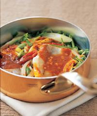 | 동태 미나리찜 Cooking time 18´ 생선찜은 약한 불에서 오래 찌는 것보다 중불에서 빨리 조리해야 살이 부서지지 않는다. 양념장 녹말물 약간 넣은 고춧가루 양념 고춧가루와 다진 마늘을 비롯한 갖은 양념을 넣고 고루 섞은 뒤 녹말물을 약간 넣어 조리해야 입에 착착 붙는 양념이 완성된다. 재_료 동태 2마리, 미나리 150g, 굵은 파 ½대, 풋고추·붉은 고추 1개씩, 양파 ½개 고춧가루 양념 : 고춧가루 2큰술, 설탕 1큰술, 다진 마늘 2작은술, 청주·참기름 ½큰술씩, 소금·후춧가루 약간씩, 녹말물 3큰술, 물 1컵 만_들_기 1_동태는 깨끗하게 손질해 등뼈를 중심으로 반으로 펼친 후 소금을 약간 뿌려 한김 오르도록 찐다. 2_미나리는 잎을 대충 훑어내고 4~5cm 길이로 썰고 굵은 파는 어슷하게 저며썬다. 양파는 굵직하게 채썰고 고추는 어슷하게 썰어 씨를 대충 턴다. 3_曼舟?양념을 한데 담고 고루 섞어 한소끔 끓인다. 4_냄비에 미나리를 깔고 살짝 찐 동태를 올린 뒤 양파와 굵은 파, 고추를 얹고 양념장을 끼얹어 중불에서 살짝 더 찐다. |