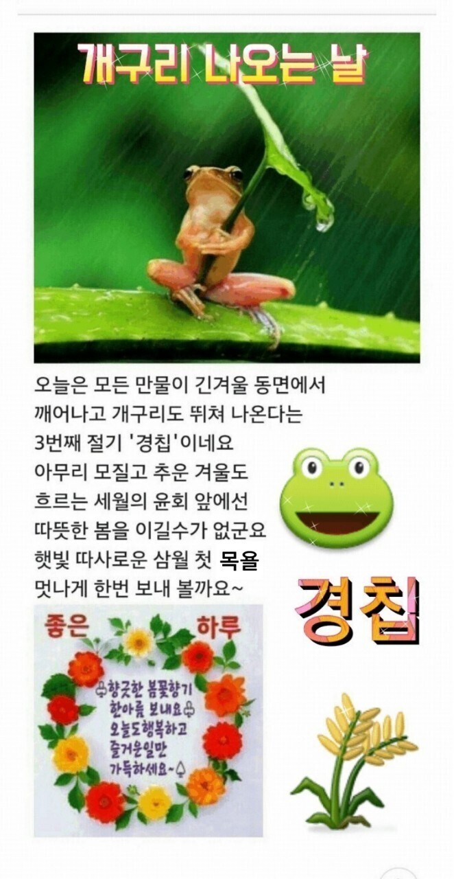 오늘은 겨울잠 자던 개구리가 나오는 경칩입니다.