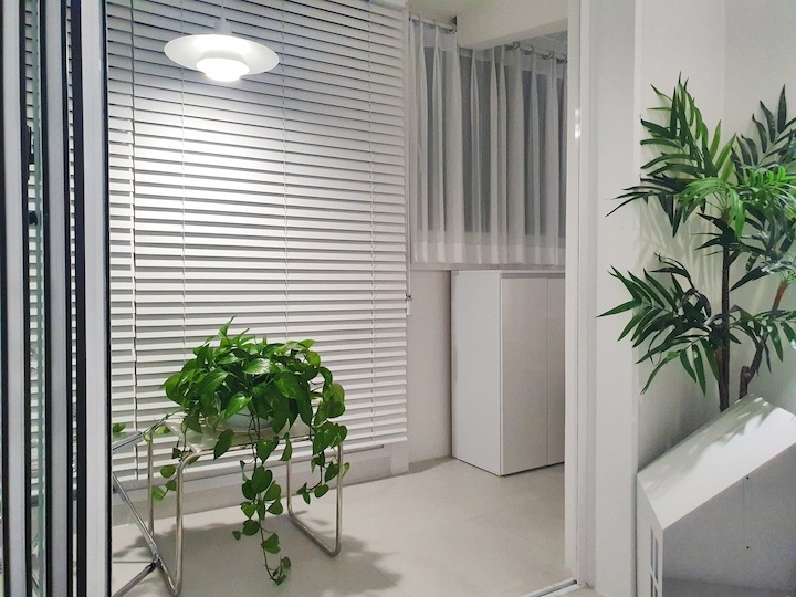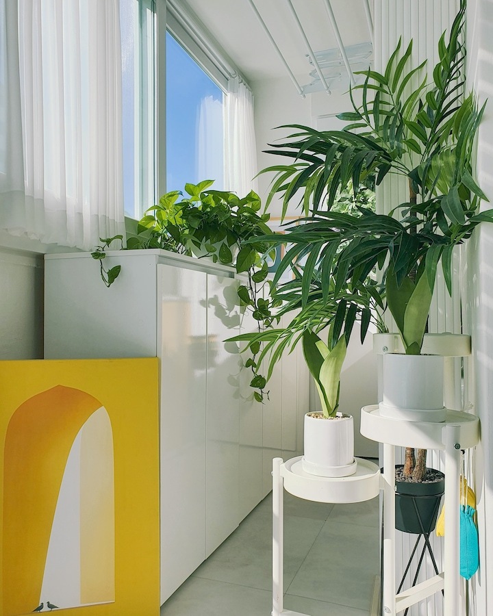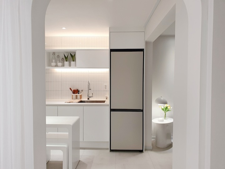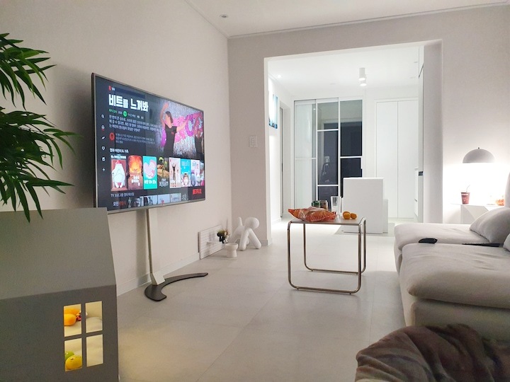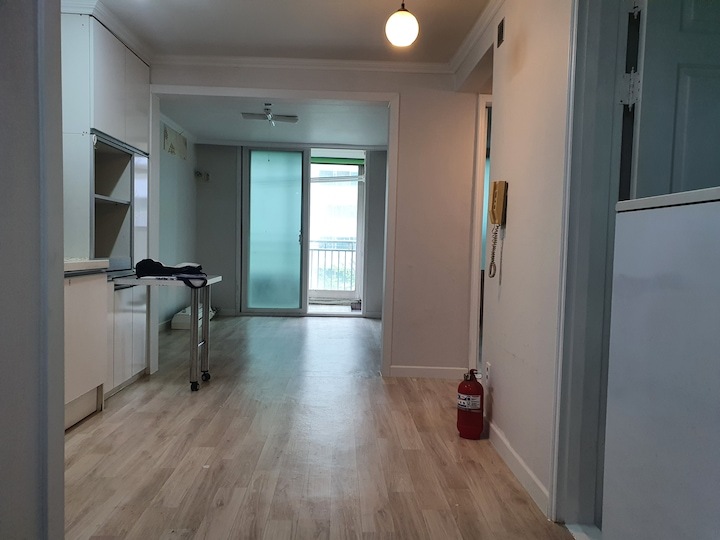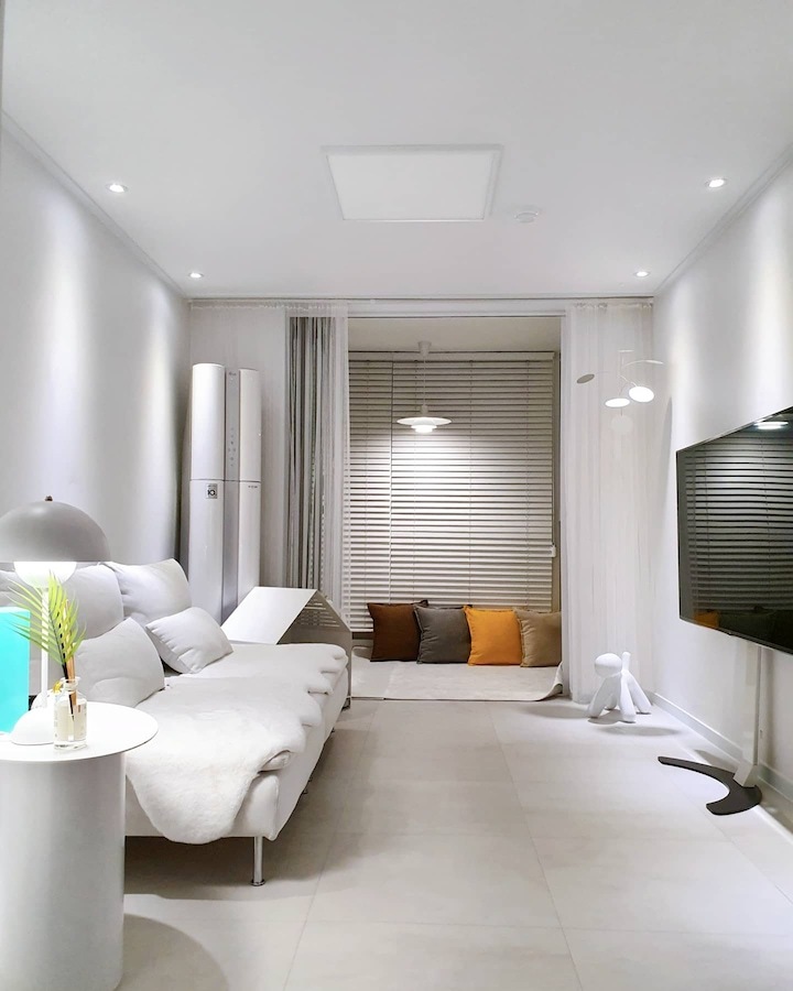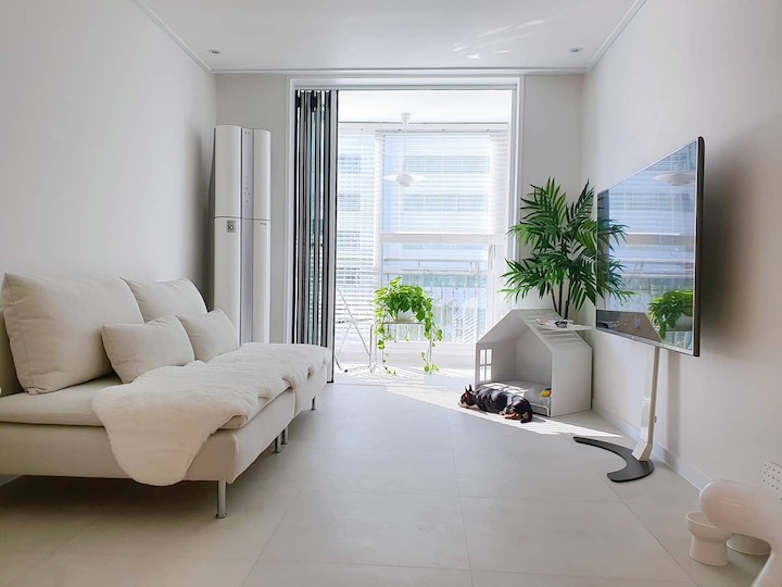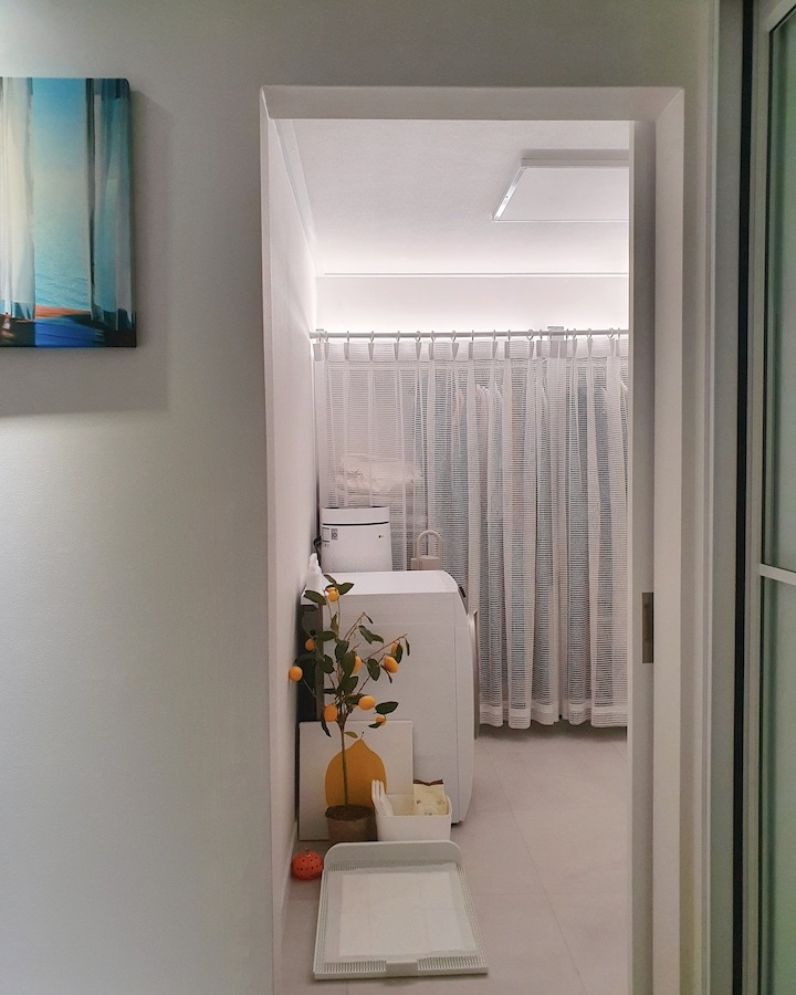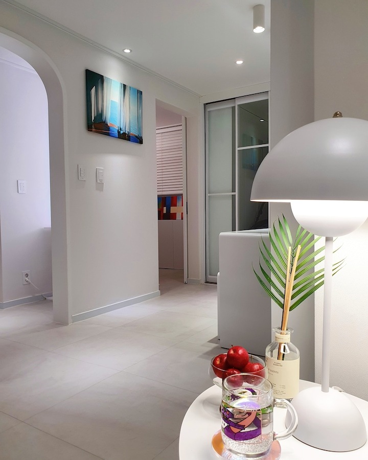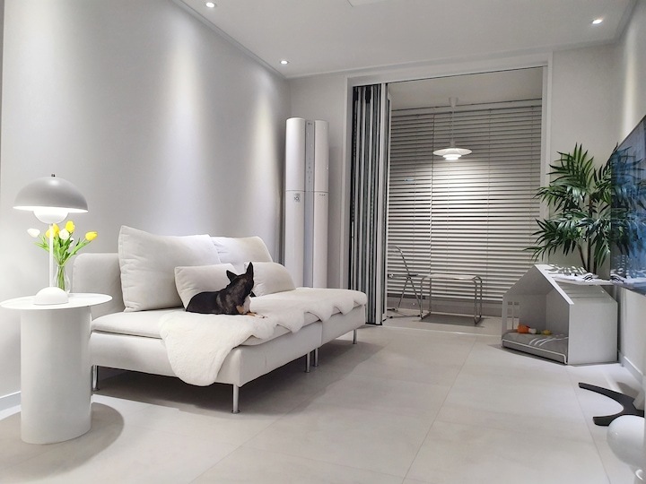 | Before 저희 집은 25년 된 평범한 21평 복도식 아파트예요. 아파트가 오래돼서 리모델링을 계획하긴 했지만 실제 이 집을 봤을 때는 상태가 양호했어요. 그러다 보니 주변에서 혼자 사는 데다 구축인데 공사를 왜 그렇게 많이 하냐고 말리기도 해서 부분 공사만 할까 잠깐 갈등했었죠. 하지만 저는... '응? 나 혼자 아니고, 탄이도 있는데?' '응? 구축이니까 더 해야 하지 않을까?'라는 생각에 결국 올리모델링을 진행했습니다. ^^ (공사 전 사진이 많이 없네요...) BEFORE After 주방 현관문을 열면 좌측으로 바로 주방이 있어요. 집 들어서자마자 바로 보이는 곳인데 공간이 많이 협소해요. 주방은 전체 철거 후 제가 원하는 스타일로 요청해 시공했어요. 주방은 온갖 주방 살림살이가 있고 식탁이 있기 때문에 이 좁은 공간이 최대한 깔끔하고 답답해 보이지 않게 하려고 했어요. 상부장은 원래 안 하려다가 좁은 주방의 수납 때문에 천장을 띄운 수납장을 설치했어요. 수납장 문은 한쪽만 달아서 답답함을 좀 해결할 수 있었고 작은 소품이나 예쁜 그릇을 두면 인테리어 효과도 낼 수 있는 것 같아요. 싱크볼은 크고 깊은 것으로 했는데 설거지한 식기를 싱크대 위로 올리지 않아 좁은 주방을 깨끗하게 보이게 할 수 있어요. 그리고 욕실에 욕조가 없기 때문에 탄이 목욕도 여기서 시키고 있네요. ^^; 인덕션 아래는 전자레인지 및 소형 전기밥솥을 수납하였고 그 외 그릇 및 조리에 필요한 조미료 등 꼭 필요하고 많이 쓰는 것들을 수납할 수 있게 수납장을 짰어요. 식탁은 폭이 넓지 않은 것으로 알아보다 지금 이 제품을 찾았고 의자도 벤치형으로 되어 있어서 좁은 공간에 딱이었어요. 의자는 미사용 시에 식탁 밑으로 넣으면 안 보이기 때문에 공간을 좀 더 넓게 사용할 수 있어요. 냉장고장은 냉장고가 핏에 딱 맞게 들어가야 했기에 싱크대 사장님과 몇 차례나 체크했는지 몰라요. 정면에서 봤을 때 상부장과 냉장고장이 예쁘게 잘 시공되어 뿌듯합니다. 주방은 창문이 없어 채광이 없고, 상부장 폭이 좀 깊은 편이라 그늘져 어두워 보일 수 있을 것 같아서 간접 조명을 설치했어요. 우선 조명 때문에 밝아서 주방에서 일할 때 어둡지 않아 좋아요. 그리고 상부장 바로 아래가 아닌 뒤로 설치를 했기 때문에 눈이 아프지도 않답니다. 그리고 조명만 켜놔도 은은하게 분위기 연출도 되어서 인테리어 효과도 있어요. 화이트 주방이라 요리할 때 치우면서 하는 편이고 음식을 다 먹고 난 후에도 설거지, 주방 정리는 그때그때 바로 하는 편이에요. 김칫국물 같은 게 묻게 되면 그때 바로 닦으면 닦이는데 시간이 지나면 스며들어 얼룩이 생기거든요. 주방은 조금만 소홀히 하면 정리도 청소도 힘들어지기 때문에 습관처럼 닦고 치우는 것 같아요. 그리고 요즘은 성능 좋은 주방 청소 제품들도 많이 나와서 도움도 받고 있죠. ^^ 주방 전체 컬러 톤은 화이트이지만 너무 차갑게 보이지 않게 우드톤의 주방 살림을 두었고 식물, 유리병 등을 매치하는 등 그때그때 맘에 드는 인테리어 소품을 두어 분위기를 바꿔 주고 있어요. 거실 바닥은 엘지 엑스컴포트 제품으로 장판 시공을 했어요. 타일이나 마루 시공을 하고 싶었는데 아무래도 뛰는 걸 좋아하는 탄이 때문에 할 수가 없었어요. 장판도 두껍고 화이트톤 인테리어에 맞는 것으로 찾았는데 만족합니다. 좁은 거실을 좀 더 넓어 보이게 하면서 공간 확보를 위해 폴딩도어를 설치했어요. 사실 탄이 때문에 폴딩도어가 인테리어 공사 1순위였어요. 공을 가지고 뛰어노는 걸 좋아하는 아이라 넓은 공간은 필수였어요. 주방의 식탁을 싱크대 쪽으로 붙이면 베란다에서 중문까지 우다다 거리며 뛸 수 있고 실제로 탄이가 너무 잘 놀고 있어요. 거실 역시 화이트 톤이다 보니 여름에는 식물 배치로 시원하고 싱그러운 느낌을 내봤어요. 가을엔 러그와 쿠션 조합으로 따뜻한 가을 색을 낼 수 있어요. 아직 이 집에서 여름, 가을 두 계절만 지내봤는데 올겨울엔 어떻게 꾸밀지 어떤 느낌이 날지 기대되네요. ^^ 거실 구석구석에 강아지 집, 식기, 쉬는 베드 등 탄이 물건들을 두어야 했지만 공간 분위기를 해치지 않으려 신경 썼어요. 나름 만족하며 탄이와 제가 제일 오랜 시간 함께 머무는 공간이 되었어요. 아기자기하고는 거리가 먼 성격이라 소품들을 찾을 때도 큰 것들만 눈에 보이더라고요. 큰 소품들로 배치해봤더니 집과 소품이 따로 노는 느낌이라 작은 소품들을 찾게 됐어요. 소품을 고를 땐 우선 좁은 집이 더 좁아 보이지 않아야 하고 한 공간이 아닌 여러 공간에 매칭했을 때 다 잘 어울릴 수 있는 것들로 찾게 되는 것 같아요. 안방 원래 집 구조는 안방 문, 욕실 문, 벽장 문이 있었어요. 좁은 공간에 문이 3개나 있고 어둡고 답답해 보이더라고요. 그래서 거실에서 들어가는 입구는 아치형으로 시공하고 침실, 욕실, 파우더룸이 분리되어 있지만 한 공간에 있는 듯한 느낌도 들게 했답니다. 침실 입구는 일반 여닫이문이었는데 전체 문틀을 제거하고 매거진랙이 달린 슬라이딩도어로 설치하였고, 벽장문 쪽은 다행히 내력벽이 아니라 다 헐고 파우더룸으로 만들었어요. 방문이 없으니 공간도 훨씬 