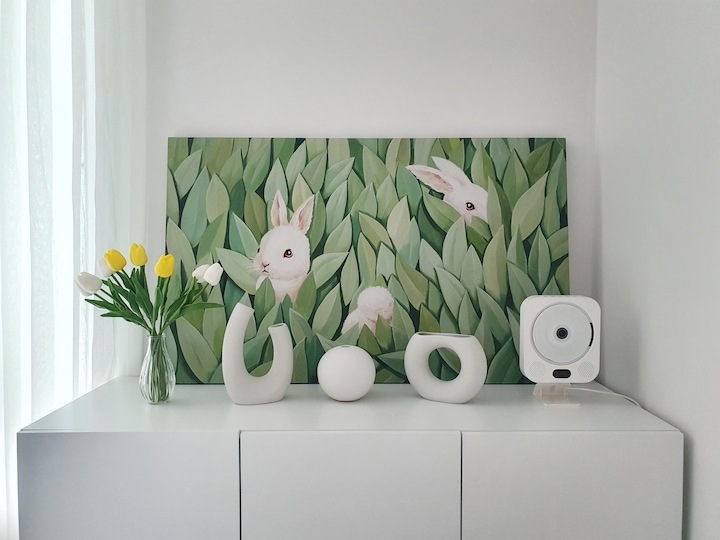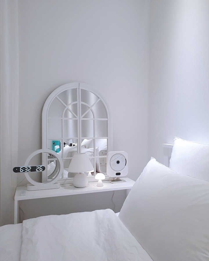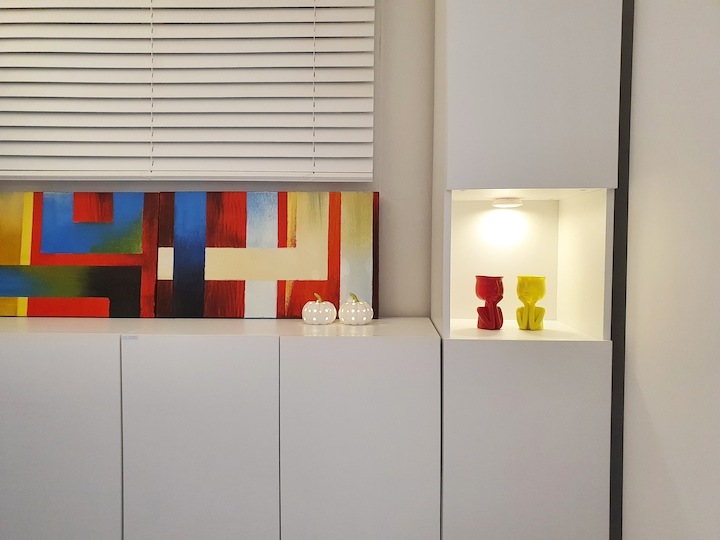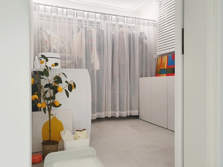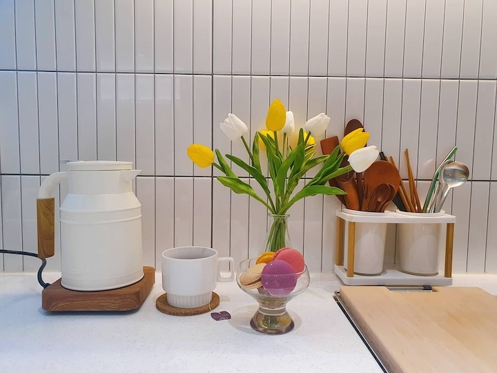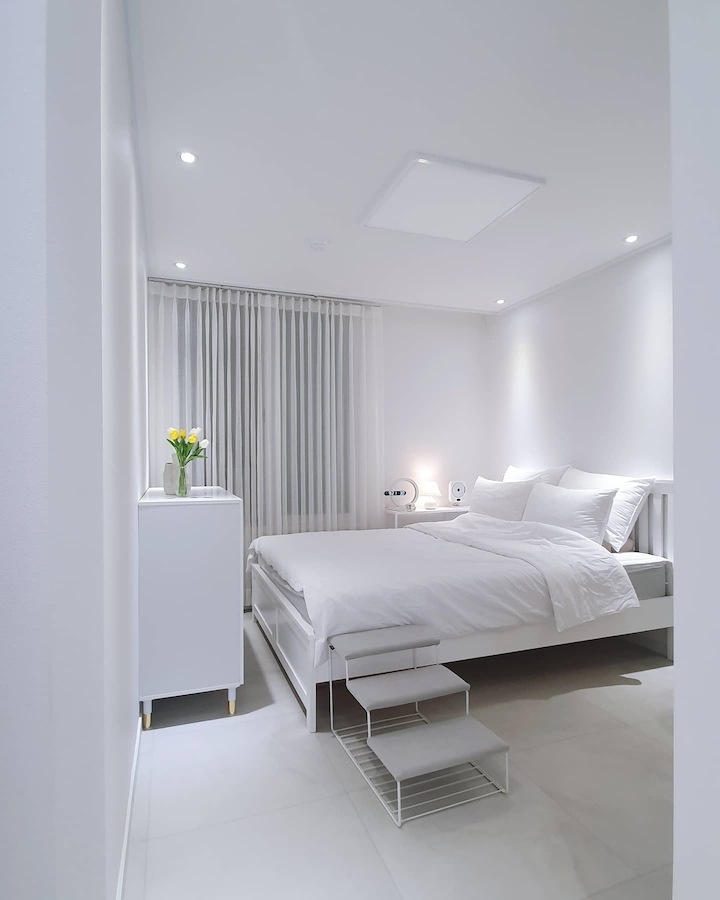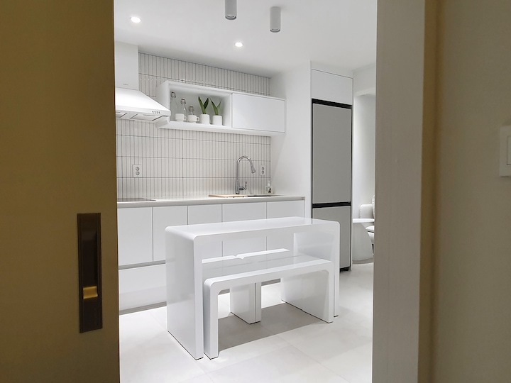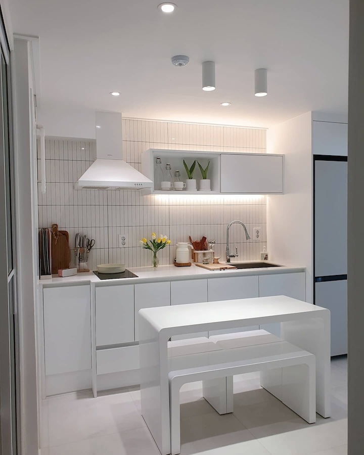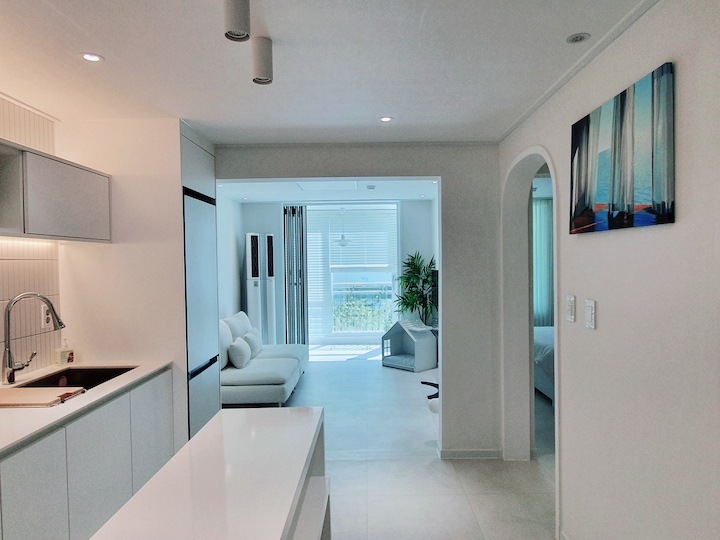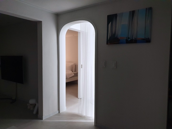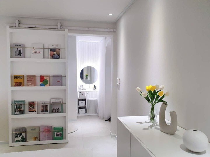 | Before 저희 집은 25년 된 평범한 21평 복도식 아파트예요. 아파트가 오래돼서 리모델링을 계획하긴 했지만 실제 이 집을 봤을 때는 상태가 양호했어요. 그러다 보니 주변에서 혼자 사는 데다 구축인데 공사를 왜 그렇게 많이 하냐고 말리기도 해서 부분 공사만 할까 잠깐 갈등했었죠. 하지만 저는... '응? 나 혼자 아니고, 탄이도 있는데?' '응? 구축이니까 더 해야 하지 않을까?'라는 생각에 결국 올리모델링을 진행했습니다. ^^ (공사 전 사진이 많이 없네요...) BEFORE After 주방 현관문을 열면 좌측으로 바로 주방이 있어요. 집 들어서자마자 바로 보이는 곳인데 공간이 많이 협소해요. 주방은 전체 철거 후 제가 원하는 스타일로 요청해 시공했어요. 주방은 온갖 주방 살림살이가 있고 식탁이 있기 때문에 이 좁은 공간이 최대한 깔끔하고 답답해 보이지 않게 하려고 했어요. 상부장은 원래 안 하려다가 좁은 주방의 수납 때문에 천장을 띄운 수납장을 설치했어요. 수납장 문은 한쪽만 달아서 답답함을 좀 해결할 수 있었고 작은 소품이나 예쁜 그릇을 두면 인테리어 효과도 낼 수 있는 것 같아요. 싱크볼은 크고 깊은 것으로 했는데 설거지한 식기를 싱크대 위로 올리지 않아 좁은 주방을 깨끗하게 보이게 할 수 있어요. 그리고 욕실에 욕조가 없기 때문에 탄이 목욕도 여기서 시키고 있네요. ^^; 인덕션 아래는 전자레인지 및 소형 전기밥솥을 수납하였고 그 외 그릇 및 조리에 필요한 조미료 등 꼭 필요하고 많이 쓰는 것들을 수납할 수 있게 수납장을 짰어요. 식탁은 폭이 넓지 않은 것으로 알아보다 지금 이 제품을 찾았고 의자도 벤치형으로 되어 있어서 좁은 공간에 딱이었어요. 의자는 미사용 시에 식탁 밑으로 넣으면 안 보이기 때문에 공간을 좀 더 넓게 사용할 수 있어요. 냉장고장은 냉장고가 핏에 딱 맞게 들어가야 했기에 싱크대 사장님과 몇 차례나 체크했는지 몰라요. 정면에서 봤을 때 상부장과 냉장고장이 예쁘게 잘 시공되어 뿌듯합니다. 주방은 창문이 없어 채광이 없고, 상부장 폭이 좀 깊은 편이라 그늘져 어두워 보일 수 있을 것 같아서 간접 조명을 설치했어요. 우선 조명 때문에 밝아서 주방에서 일할 때 어둡지 않아 좋아요. 그리고 상부장 바로 아래가 아닌 뒤로 설치를 했기 때문에 눈이 아프지도 않답니다. 그리고 조명만 켜놔도 은은하게 분위기 연출도 되어서 인테리어 효과도 있어요. 화이트 주방이라 요리할 때 치우면서 하는 편이고 음식을 다 먹고 난 후에도 설거지, 주방 정리는 그때그때 바로 하는 편이에요. 김칫국물 같은 게 묻게 되면 그때 바로 닦으면 닦이는데 시간이 지나면 스며들어 얼룩이 생기거든요. 주방은 조금만 소홀히 하면 정리도 청소도 힘들어지기 때문에 습관처럼 닦고 치우는 것 같아요. 그리고 요즘은 성능 좋은 주방 청소 제품들도 많이 나와서 도움도 받고 있죠. ^^ 주방 전체 컬러 톤은 화이트이지만 너무 차갑게 보이지 않게 우드톤의 주방 살림을 두었고 식물, 유리병 등을 매치하는 등 그때그때 맘에 드는 인테리어 소품을 두어 분위기를 바꿔 주고 있어요. 거실 바닥은 엘지 엑스컴포트 제품으로 장판 시공을 했어요. 타일이나 마루 시공을 하고 싶었는데 아무래도 뛰는 걸 좋아하는 탄이 때문에 할 수가 없었어요. 장판도 두껍고 화이트톤 인테리어에 맞는 것으로 찾았는데 만족합니다. 좁은 거실을 좀 더 넓어 보이게 하면서 공간 확보를 위해 폴딩도어를 설치했어요. 사실 탄이 때문에 폴딩도어가 인테리어 공사 1순위였어요. 공을 가지고 뛰어노는 걸 좋아하는 아이라 넓은 공간은 필수였어요. 주방의 식탁을 싱크대 쪽으로 붙이면 베란다에서 중문까지 우다다 거리며 뛸 수 있고 실제로 탄이가 너무 잘 놀고 있어요. 거실 역시 화이트 톤이다 보니 여름에는 식물 배치로 시원하고 싱그러운 느낌을 내봤어요. 가을엔 러그와 쿠션 조합으로 따뜻한 가을 색을 낼 수 있어요. 아직 이 집에서 여름, 가을 두 계절만 지내봤는데 올겨울엔 어떻게 꾸밀지 어떤 느낌이 날지 기대되네요. ^^ 거실 구석구석에 강아지 집, 식기, 쉬는 베드 등 탄이 물건들을 두어야 했지만 공간 분위기를 해치지 않으려 신경 썼어요. 나름 만족하며 탄이와 제가 제일 오랜 시간 함께 머무는 공간이 되었어요. 아기자기하고는 거리가 먼 성격이라 소품들을 찾을 때도 큰 것들만 눈에 보이더라고요. 큰 소품들로 배치해봤더니 집과 소품이 따로 노는 느낌이라 작은 소품들을 찾게 됐어요. 소품을 고를 땐 우선 좁은 집이 더 좁아 보이지 않아야 하고 한 공간이 아닌 여러 공간에 매칭했을 때 다 잘 어울릴 수 있는 것들로 찾게 되는 것 같아요. 안방 원래 집 구조는 안방 문, 욕실 문, 벽장 문이 있었어요. 좁은 공간에 문이 3개나 있고 어둡고 답답해 보이더라고요. 그래서 거실에서 들어가는 입구는 아치형으로 시공하고 침실, 욕실, 파우더룸이 분리되어 있지만 한 공간에 있는 듯한 느낌도 들게 했답니다. 침실 입구는 일반 여닫이문이었는데 전체 문틀을 제거하고 매거진랙이 달린 슬라이딩도어로 설치하였고, 벽장문 쪽은 다행히 내력벽이 아니라 다 헐고 파우더룸으로 만들었어요. 방문이 없으니 공간도 훨씬 