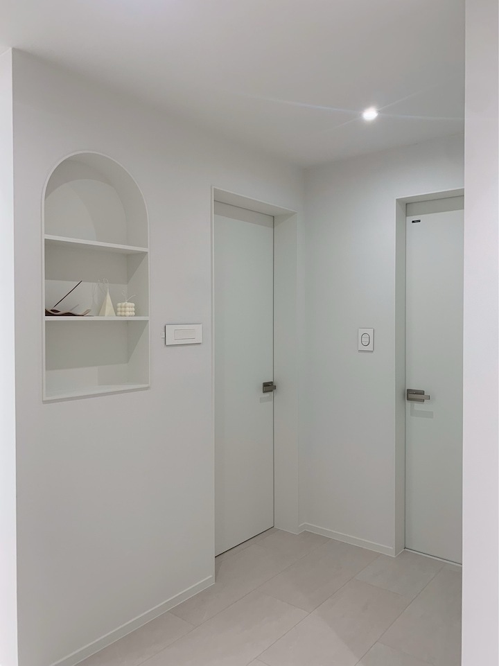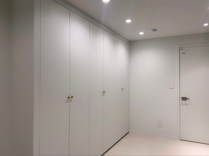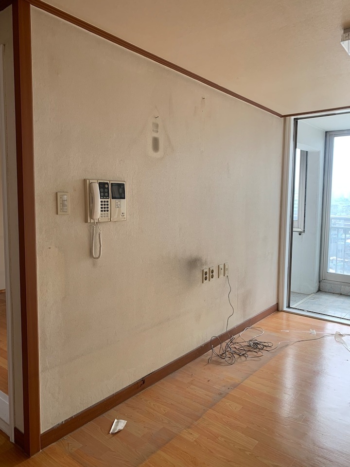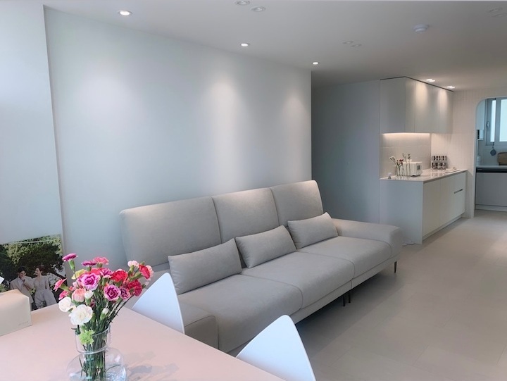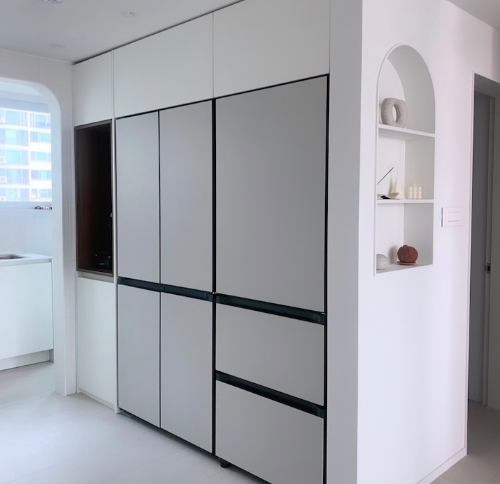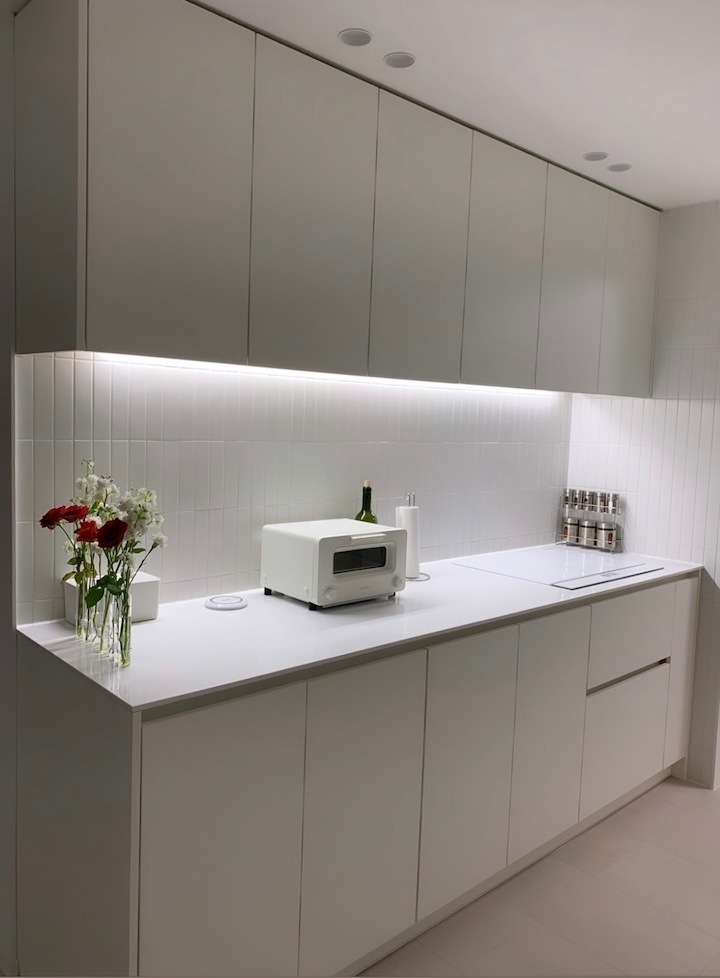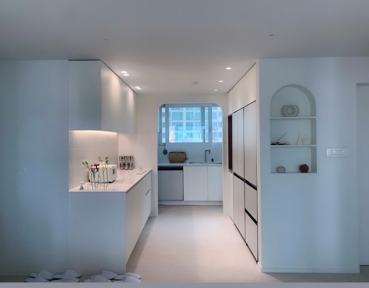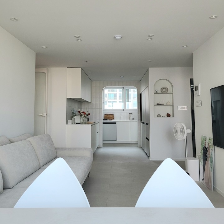 첫 보금자리에 대한 로망으로 집을 이쁘게 꾸미고 싶은 마음이 굴뚝같았지만, 원자재비 급등으로 인해 업체에 맡기면 저희 예산을 초과할 수밖에 없었습니다. 저희의 로망을 실현하기 위해서 셀프 인테리어로 결정! 대기업 건설사 8년 차 남편의 주도하에 4주간의 인테리어를 진행하게 됐습니다. 도면&계획 저희 집은 25년된 구축 아파트로 24평으로 거실 발코니와 침실2 발코니는 확장을 했습니다. 침실1은 안방, 침실2는 서재, 침실3은 드레스룸과 화장대를 배치하기로 했답니다. (방이 큰 순서별로 침실1,2,3 으로 정했어요!) 처음 집을 봤을 때 가장 큰 고민은 주방이었어요. 어설프게 확장이 되어 있는 상태라 분배기의 위치가 애매했고, 바닥의 평활도 불량(40mm 레벨 차이), 구축이라 천정 내부 공간이 낮아 주방 후드 이동 불가하다는 점 등의 문제가 있었어요. 그리고, 주방 한가운데에 AD 실이 있어 "ㄷ"자형 혹은 대면형 주방이 불가능한 구조였어요. 정~말 3주 이상의 오랜 고민 끝에, 분배기 위치(싱크대) / 인덕션 위치 /주방 발코니(세탁실)을 모두 살리는 구조로 정했어요! 단, 500 이상 튀어나온 AD실이 미관상 별로여서 아치 가벽을 시공해서 디자인 요소를 추가했어요ㅎㅎ (AD실만 빼면 'ㄷ'자 주방이에요!) 세장비가 긴 구조라 식탁은 거실 발코니 확장부인 창가 쪽에 두기로 했어요. 손님 초대를 좋아하는 저에겐 큰 식탁이 필요했기 때문에 너무 만족한답니다! 주방구조 검토과정 - 주방 1안 : 주방발코니로 가는 터닝도어 삭제, 작은방에 문 신설하여 'ㄷ'자 주방 실현 -> (미확정) 세탁실 가는 동선 어려움, 후드이동불가, AD실 미관 저해 - 주방 3안 : 주방 발코니 입구 유지, 인덕션 위치 유지, 분배기 위치 유지 -> 최종안 확정, 단 AD실을 가리기 위해 아치 가벽을 만들어서 디자인 요소 추가! 💡 구축 인테리어 꿀팁 - 분배기 위치 및 높이, 크기 확인 - 세대분전반 위치 확인 (저희 부부는 이것 때문에 고민이 많았답니다..ㅎㅎ) - 확장부 날개벽, 기둥 등 철거 가능 여부 (저희 침실2 기둥과 날개벽은 내력벽이기 때문에 철거가 불가능했어요) 이제 본격적으로 집 구경을 해볼까요? 아직 여러 가구, 소품들이 들어오기 전이라서 미흡하지만 이쁘게 구경해주세요 :) 현관 Before 신발장, 타일, 디딤석 다 철거했어요! (남편이 직접 철거했어요..ㅋㅋ) 현관 After 구옥 아파트라서 소음과 난방 효과를 위해 중문을 설치했습니다. 화이트 & 아치형 컨셉에 맞춰 디자인을 골랐어요! 짠! 현관 조명은 2인치 cob를 벽 쪽에 붙혀서 산모양으로 비췄어요! 여기에 액자를 달 예정입니다. 신발장은 우드 공간 박스와 하부에 전구색 t5 간접등을 설치해서 따뜻한 느낌을 한층 더해줬어요. 타일은 발품 3주를 다녀본 결과, 윤현상재 이모션 화이트로 선택해서 자칫 좁아 보일 수 있는 현관을 넓게 보이도록 했어요! (아직 장식장을 꾸미진 못했네요..ㅎㅎ) 거실 Before 주방-거실까지 긴 구조인 구축 20평대 아파트..ㅠㅠ 단창으로 되어있어서 너무 추울 것으로 예상됐어요.. 확장 후 이중창으로 변경했어요! 거실 After 확장으로 훨씬 시원해진 저희 집 거실입니다. 저희는 법적인 사항을 다 준수하며 시공을 했어요! 측벽 세대여서 발코니 확장 시 방화문이 꼭 필요해요! 발코니에 방화문을 시공하고, 내부 쪽엔 히든도어를 설치해서 발코니 문을 최대한 이쁘게 만들었어요! 베란다가 있던 쪽에는 다이닝 테이블을 두었는데요, 화이트 상판과 의자, 크롬/니켈 다리들이 만나 차분한 화이트톤 느낌이에요! 거실 양쪽 벽면에 주백색 3인치 cob로 조명의 무드를 한껏 살렸어요! 커튼박스 등 간접등은 모두 전구색! (아직 커텐을 달기 전이라 아쉽네요ㅠㅠ) 아직 거실에는 많은 소품을 꺼내두지 않고 깔끔하게 유지하고 있습니다. 거실 복도를 지나면 아치가벽을 세워서 만든 선반이 있어요. 아치 선반은 언제나 옳죠~! 무몰딩과 9mm문선, 아치가벽 로망을 실현해준 내 남편 최고! 주방 Before 왼쪽에 AD실이 떡하니!!!! 주방 발코니 문은 측벽에 딱 붙혀 내버리고.. (뒷모습도 처참한 울 남편) 부엌 확장이 엉망진창이었어요ㅠㅠ 게다가 오른쪽 벽에 세대 분전반 보이시나요?..주방 벽에 있다니!!!!! 여긴 냉장고, 김치냉장고장과 미니 진열장이 들어가야 하는데~ㅠㅠ 다행히 해결책을 찾았는데요, 아래에서 보여드릴게요. 주방 After 제가 제일 애정하는 주방을 거실에서 바라본 모습입니다! ♥ 주방의 컨셉이 잘 드러나는 사진이에요. 주방의 컨셉은 화이트+아치+귀여움이에요! 좌측엔 인덕션과 상하부장 우측엔 냉장고장+김치냉장고+미니 홈바를 배치했어요. AD실이 튀어나온 것이 너무 못생겨서 냉장고장을 짜면서 아치 가벽을 만들었더니, AD실도 안보이고 주방 발코니로 나가는 못생긴 터닝도어가 안 보여요~~ㅋㅋ! 귀여운 느낌을 살리기 위해서 아치벽과 미드웨이는 피아노타일(모눈타일)을 시공했어요! 상판은 엘지 하이막스 오로라블랑입니다. 화이트 컨셉에 걸맞는 디트리쉬 인덕션과 화이트 르그랑 화이트 매립콘센트! (디트리쉬 인덕션은 직구했어요) 그리고, 전자레인지는 인덕션 하부에 놨어요~! (문을 달아서 미사용시는 안 보이게!) 싱크볼은 백조싱크800이에요! 780
