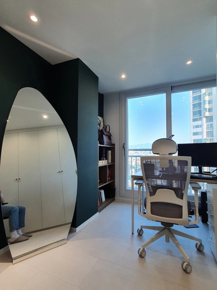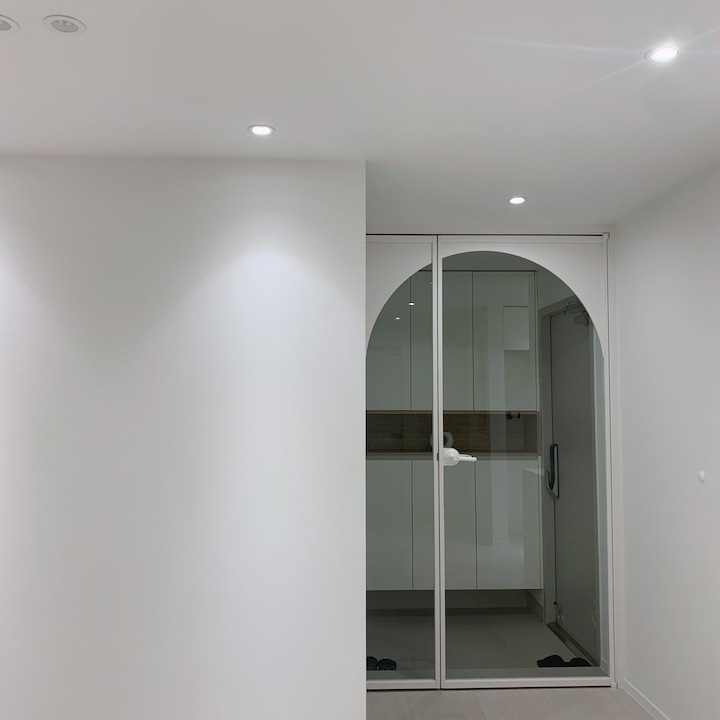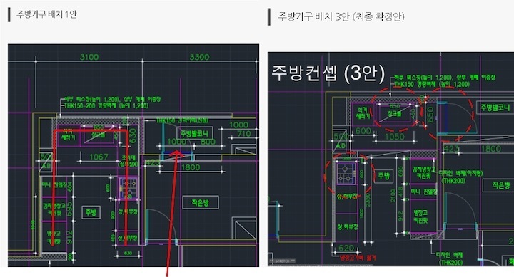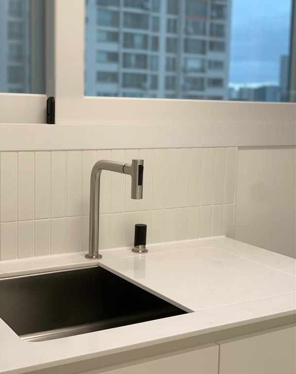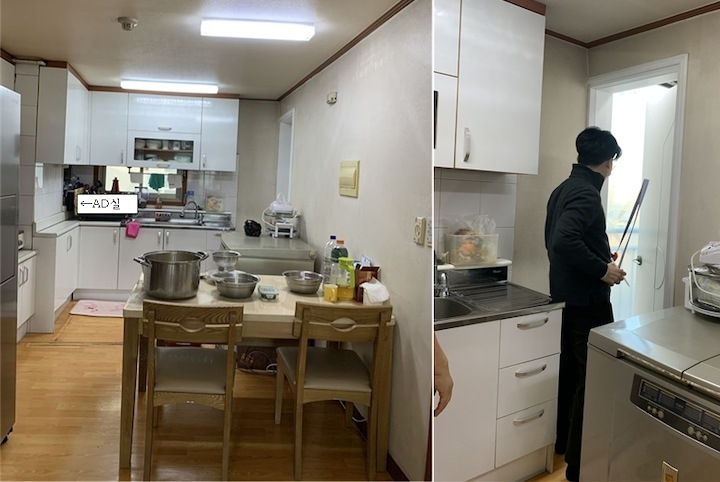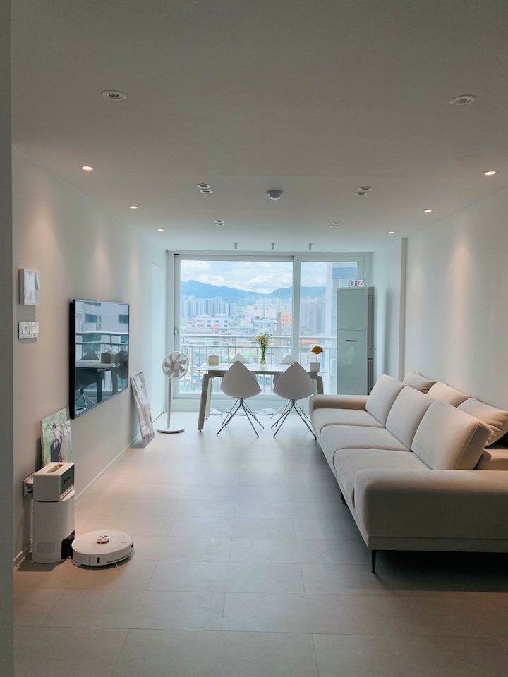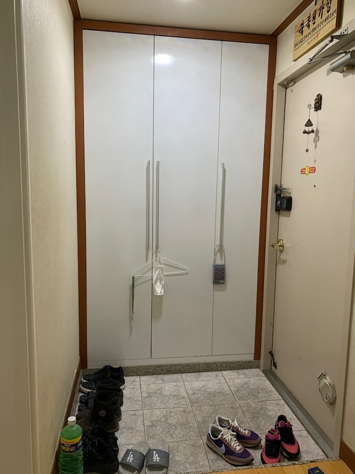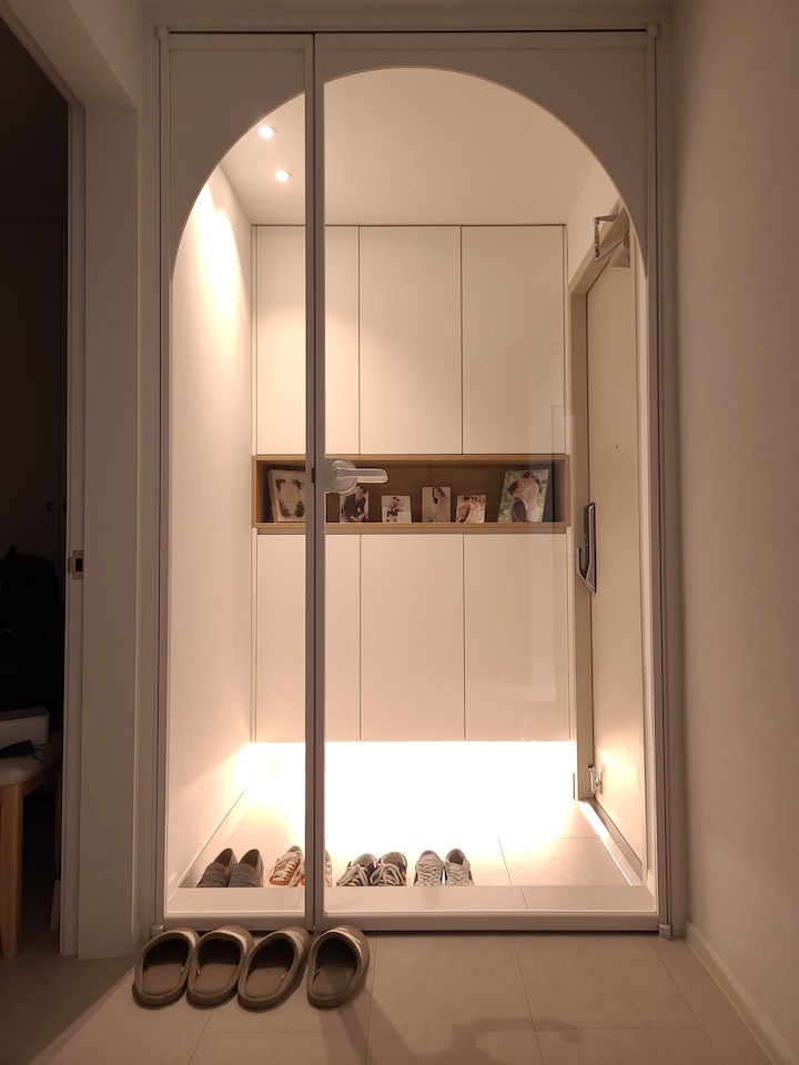 첫 보금자리에 대한 로망으로 집을 이쁘게 꾸미고 싶은 마음이 굴뚝같았지만, 원자재비 급등으로 인해 업체에 맡기면 저희 예산을 초과할 수밖에 없었습니다. 저희의 로망을 실현하기 위해서 셀프 인테리어로 결정! 대기업 건설사 8년 차 남편의 주도하에 4주간의 인테리어를 진행하게 됐습니다. 도면&계획 저희 집은 25년된 구축 아파트로 24평으로 거실 발코니와 침실2 발코니는 확장을 했습니다. 침실1은 안방, 침실2는 서재, 침실3은 드레스룸과 화장대를 배치하기로 했답니다. (방이 큰 순서별로 침실1,2,3 으로 정했어요!) 처음 집을 봤을 때 가장 큰 고민은 주방이었어요. 어설프게 확장이 되어 있는 상태라 분배기의 위치가 애매했고, 바닥의 평활도 불량(40mm 레벨 차이), 구축이라 천정 내부 공간이 낮아 주방 후드 이동 불가하다는 점 등의 문제가 있었어요. 그리고, 주방 한가운데에 AD 실이 있어 "ㄷ"자형 혹은 대면형 주방이 불가능한 구조였어요. 정~말 3주 이상의 오랜 고민 끝에, 분배기 위치(싱크대) / 인덕션 위치 /주방 발코니(세탁실)을 모두 살리는 구조로 정했어요! 단, 500 이상 튀어나온 AD실이 미관상 별로여서 아치 가벽을 시공해서 디자인 요소를 추가했어요ㅎㅎ (AD실만 빼면 'ㄷ'자 주방이에요!) 세장비가 긴 구조라 식탁은 거실 발코니 확장부인 창가 쪽에 두기로 했어요. 손님 초대를 좋아하는 저에겐 큰 식탁이 필요했기 때문에 너무 만족한답니다! 주방구조 검토과정 - 주방 1안 : 주방발코니로 가는 터닝도어 삭제, 작은방에 문 신설하여 'ㄷ'자 주방 실현 -> (미확정) 세탁실 가는 동선 어려움, 후드이동불가, AD실 미관 저해 - 주방 3안 : 주방 발코니 입구 유지, 인덕션 위치 유지, 분배기 위치 유지 -> 최종안 확정, 단 AD실을 가리기 위해 아치 가벽을 만들어서 디자인 요소 추가! 💡 구축 인테리어 꿀팁 - 분배기 위치 및 높이, 크기 확인 - 세대분전반 위치 확인 (저희 부부는 이것 때문에 고민이 많았답니다..ㅎㅎ) - 확장부 날개벽, 기둥 등 철거 가능 여부 (저희 침실2 기둥과 날개벽은 내력벽이기 때문에 철거가 불가능했어요) 이제 본격적으로 집 구경을 해볼까요? 아직 여러 가구, 소품들이 들어오기 전이라서 미흡하지만 이쁘게 구경해주세요 :) 현관 Before 신발장, 타일, 디딤석 다 철거했어요! (남편이 직접 철거했어요..ㅋㅋ) 현관 After 구옥 아파트라서 소음과 난방 효과를 위해 중문을 설치했습니다. 화이트 & 아치형 컨셉에 맞춰 디자인을 골랐어요! 짠! 현관 조명은 2인치 cob를 벽 쪽에 붙혀서 산모양으로 비췄어요! 여기에 액자를 달 예정입니다. 신발장은 우드 공간 박스와 하부에 전구색 t5 간접등을 설치해서 따뜻한 느낌을 한층 더해줬어요. 타일은 발품 3주를 다녀본 결과, 윤현상재 이모션 화이트로 선택해서 자칫 좁아 보일 수 있는 현관을 넓게 보이도록 했어요! (아직 장식장을 꾸미진 못했네요..ㅎㅎ) 거실 Before 주방-거실까지 긴 구조인 구축 20평대 아파트..ㅠㅠ 단창으로 되어있어서 너무 추울 것으로 예상됐어요.. 확장 후 이중창으로 변경했어요! 거실 After 확장으로 훨씬 시원해진 저희 집 거실입니다. 저희는 법적인 사항을 다 준수하며 시공을 했어요! 측벽 세대여서 발코니 확장 시 방화문이 꼭 필요해요! 발코니에 방화문을 시공하고, 내부 쪽엔 히든도어를 설치해서 발코니 문을 최대한 이쁘게 만들었어요! 베란다가 있던 쪽에는 다이닝 테이블을 두었는데요, 화이트 상판과 의자, 크롬/니켈 다리들이 만나 차분한 화이트톤 느낌이에요! 거실 양쪽 벽면에 주백색 3인치 cob로 조명의 무드를 한껏 살렸어요! 커튼박스 등 간접등은 모두 전구색! (아직 커텐을 달기 전이라 아쉽네요ㅠㅠ) 아직 거실에는 많은 소품을 꺼내두지 않고 깔끔하게 유지하고 있습니다. 거실 복도를 지나면 아치가벽을 세워서 만든 선반이 있어요. 아치 선반은 언제나 옳죠~! 무몰딩과 9mm문선, 아치가벽 로망을 실현해준 내 남편 최고! 주방 Before 왼쪽에 AD실이 떡하니!!!! 주방 발코니 문은 측벽에 딱 붙혀 내버리고.. (뒷모습도 처참한 울 남편) 부엌 확장이 엉망진창이었어요ㅠㅠ 게다가 오른쪽 벽에 세대 분전반 보이시나요?..주방 벽에 있다니!!!!! 여긴 냉장고, 김치냉장고장과 미니 진열장이 들어가야 하는데~ㅠㅠ 다행히 해결책을 찾았는데요, 아래에서 보여드릴게요. 주방 After 제가 제일 애정하는 주방을 거실에서 바라본 모습입니다! ♥ 주방의 컨셉이 잘 드러나는 사진이에요. 주방의 컨셉은 화이트+아치+귀여움이에요! 좌측엔 인덕션과 상하부장 우측엔 냉장고장+김치냉장고+미니 홈바를 배치했어요. AD실이 튀어나온 것이 너무 못생겨서 냉장고장을 짜면서 아치 가벽을 만들었더니, AD실도 안보이고 주방 발코니로 나가는 못생긴 터닝도어가 안 보여요~~ㅋㅋ! 귀여운 느낌을 살리기 위해서 아치벽과 미드웨이는 피아노타일(모눈타일)을 시공했어요! 상판은 엘지 하이막스 오로라블랑입니다. 화이트 컨셉에 걸맞는 디트리쉬 인덕션과 화이트 르그랑 화이트 매립콘센트! (디트리쉬 인덕션은 직구했어요) 그리고, 전자레인지는 인덕션 하부에 놨어요~! (문을 달아서 미사용시는 안 보이게!) 싱크볼은 백조싱크800이에요! 780