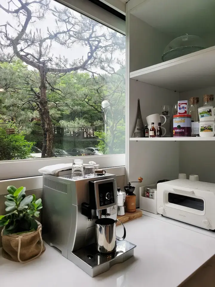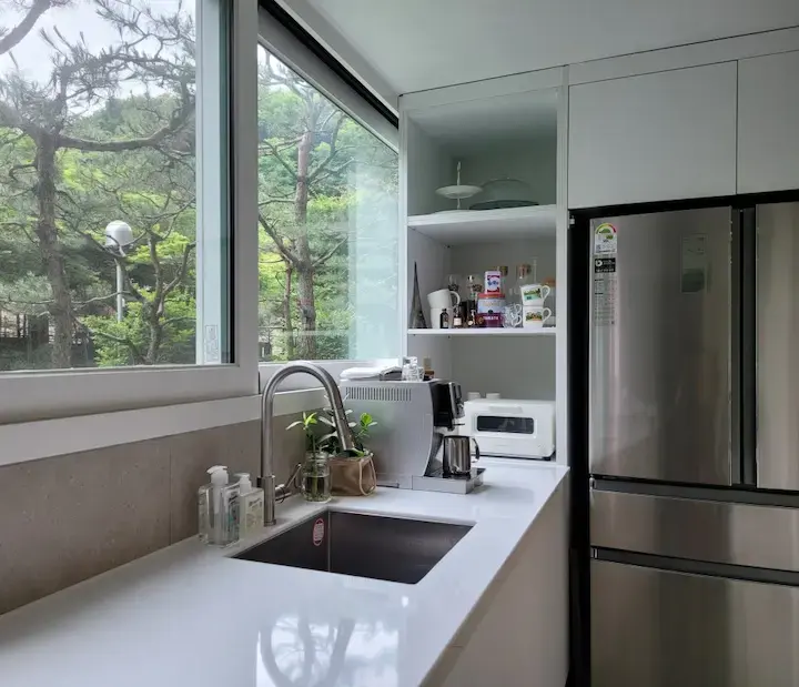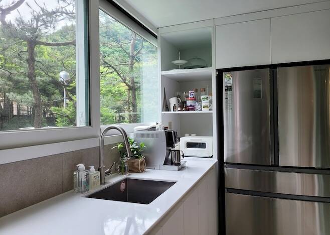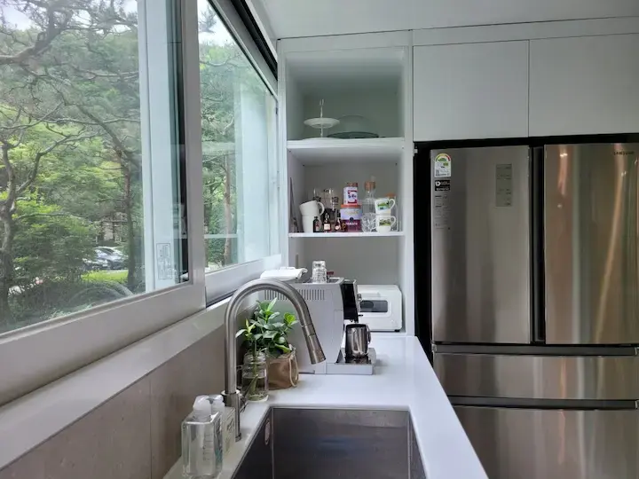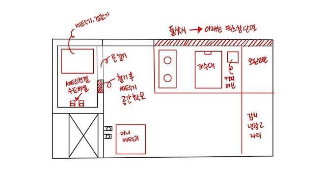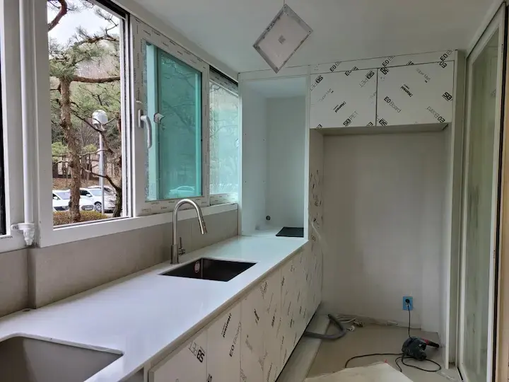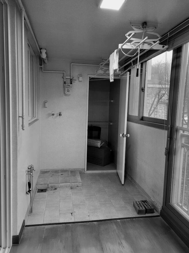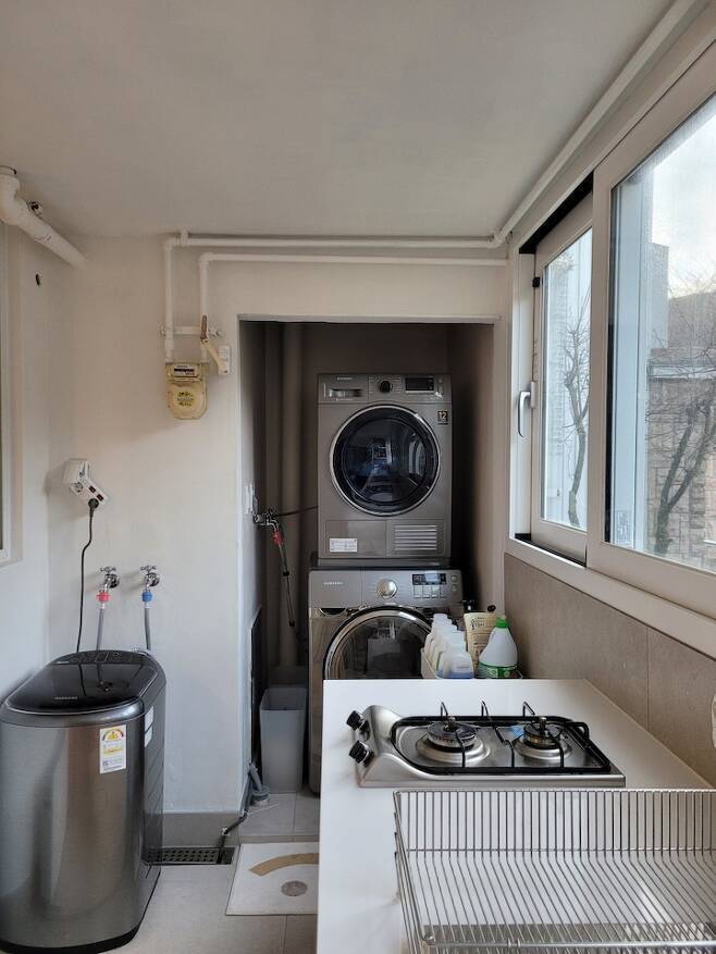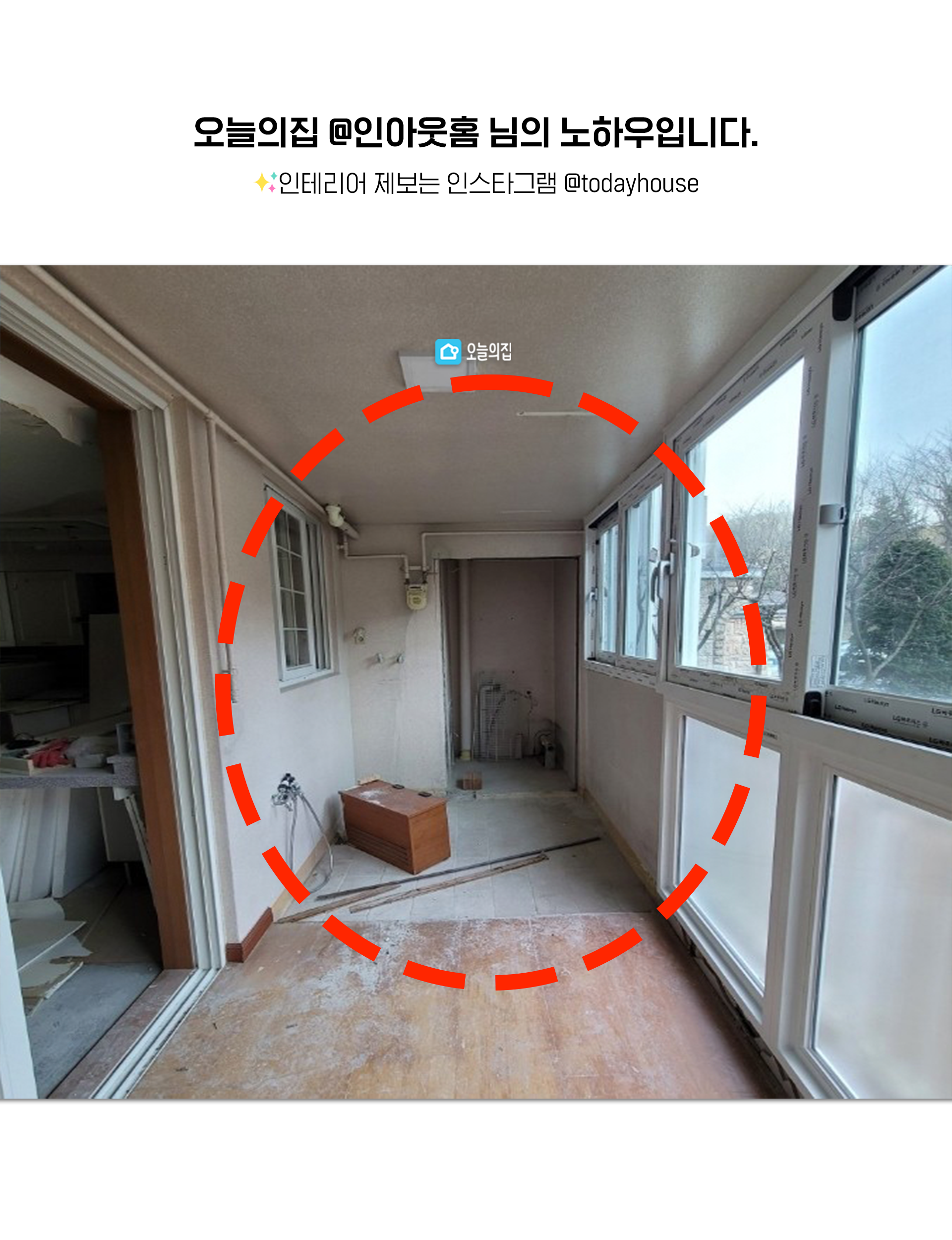 안녕하세요. 3대가 함께 살아가고 있는 인아웃홈입니다 :) | 대식구가 사는 집, 보조주방을 만들기로 하다 오늘 이야기할 베란다 인테리어는 도면의 '발코니4'로 주방 옆 다용도실 겸 베란다예요. 이 베란다의 폭이 가장 넓어서 어떤 공간으로 활용을 할까 많은 상상을 하기도 했지만 역시나 현실 세계의 공간으로 밖에 안되겠더라는...ㅎㅎ 그래서 세탁실 겸 보조주방을 만들기로 정했어요. (베란다 로망이 컸던 저는 사실 삼겹살 파티를 할 수 있는 공간으로 만들고 싶었어요...ㅋㅋㅋ 캠핑존 같은 ㅋㅋ) 그래서 리모델링 시 가장 중점적으로 생각한 부분은 아래와 같습니다. 📌 베란다 인테리어_ 보조주방 만들기 1. 대식구의 주방 살림 및 식재료를 보관할 수 있는 팬트리의 역할 필요 2. 세탁기 2대와 건조기, 김치냉장고 넣을 공간 필요 3. 홈카페 느낌 필요 ㅋㅋ 4. 싱크볼 가스레인지 둘 다 있는 보조주방 만들기 | 베란다 보조주방 Before / After 이렇게 해서 보조주방으로 변신한 베란다의 모습! 이쪽 창가 뷰가 너무 좋아요 ㅠㅠ 비오는 날 눈 오는 날 다이닝룸에서 커피 한잔하면서 보조주방 창가를 보고 있으면 진짜 힐링 ㅜㅜ 보조주방의 작은 한편에 자리 잡은 홈카페! 창가의 소나무 뷰와 함께하니 더 좋음! 📌 시작 전에 잠깐! 꼭 알아야 할 주의사항발코니 '우수관'에는 세탁기나 싱크대 사용을 할 수 없다는 사실! '우수관'은 물이 그대로 흐르기 때문에 여기에 싱크대 배관을 연결하면 안 돼요. 반면 정화 시스템을 통해 방류되는 '오수관'에는 연결이 가능해요. 저는 기존 발코니가 세탁실로 사용하는 공간이었고, 세탁실 오수를 배출하는 오수관에 싱크대 배관을 연결해서 오수를 배출하도록 공사했어요. 이렇게 설치되어야 문제가 없답니다. 발코니 보조주방 시공 전에 '내가 보조주방을 만들려고 하는 발코니에 우수관이 있는지, 오수관이 있는지' 꼭 미리 체크하세요. 아파트 관리사무소나 구청에 문의하면 아실 수 있습니다! | 베란다 보조주방 만드는 과정 1. 덩치 큰 가전 위치 정하기 베란다 레이아웃 베란다 보조주방 공사 항목 보조주방을 만들기에 앞서 일단 세탁기 2대와 건조기, 김치냉장고 자리부터 정했어요. 도면에 창고라고 표시되어 있는 곳에 원래 다양한 짐을 넣는 공간으로 사용했던 것 같은데 저희는 창고 문과 옆에 조적벽을 부분 철거해서 공간을 만들어 세탁기와 건조기를 넣었어요. 원래 싱크대 자리 쪽에 세탁기와 건조기를 나란히 옆으로 넣을까 생각도 해봤는데 엄마는 둘 다 아래에 있으면 허리가 아프다고 하셔서 그냥 수직으로 두기로 했는데 수납을 하기에도 지금 계획이 더 나아 보였어요. 비포 애프터 2. 셀프페인팅하기 베란다 벽면은 전체 셀프 페인팅으로 조금 더 깔끔하게 바꿔줬는데... 이맘때가 거의 막바지여서 너무 힘들었나 봐요... 사진이 없네요...ㅋㅋㅋ 📌 페인트 정보벤자민 무어 OC-117 Simply White 세탁기 자리 옆에도 목공 작업으로 틈새 수납을 좀 할 걸 아쉬움이 남아요. (인테리어 일정이 짧아서 할 수도 없었지만ㅎㅎ) 여기서 잠깐! 세탁실 깔끔하게 정리하는 꿀팁을 알려드릴게요! 3. 콘센트 매립하기 바로 대기전력 콘센트 매립하기! 예전에 살던 곳도 그렇고 여태껏 살면서 세탁실은 항상 멀티탭만 사용해왔던 저는 이번에 리모델링하면서 대기전력 콘센트가 따로 있다는 걸 처음 알게 되었어요. 치렁치렁 멀티탭을 사용하지 않고 리모델링 시에 스위치 콘센트를 매립하면 미관상 훨씬 깔끔하고 편리해요! 진짜 좋습니다 :) 스위치는 나노 브랜드 [스위치 부착 콘센트] 라는 제품명으로 판매가 되고 있어요. 스위치는 르그랑/나노 이렇게 사용했는데 요즘 나노 스위치는 조금 더 예뻐졌어요. 저희 집 스위치는 구형이고 신형 스위치를 검색하면 가격도 디자인도 훨씬 좋아졌어요! 4. 샷시 단열 후 싱크대 위치 정하기 베란다 보조주방 인테리어 셀프 도면이에요. 세탁실을 결정하고 보조주방 쪽으로 넘어와 고민한 부분은 아무래도 싱크대의 위치, 수납, 사이즈였어요. 수납도 많이 해야 하고 그렇다고 너무 또 답답해 보여서는 안되고 어느 쪽에 놔야 실용적일까? 고민을 많이했는데 결론은 샷시 쪽을 단열해서 싱크대를 놓기로 했어요. 이 결정이 베란다 보조주방 인테리어의 신의 한 수가 아닐까 싶어요. 기존의 풀샷시는 1층의 프라이버시에 아무런 도움을 못 주었고 단열에도 취약했기에 ㅎ 하단을 픽스창에 단열을 하고 싱크대를 주니 단열과 프라이버시도 동시에 해결되고 창가 쪽 소나무 뷰를 더 돋보이게 하여 홈 카페도 만들 수 있었어요. 일석삼조 ㅎㅎ 세탁실 옆으로는 창문이 있었고 오른쪽으로는 풀샷시여서 창문 높이로 픽스창을 맞춰 더 깔끔해졌어요! 기존의 베란다 풀 샷시창 (저희 집이 훤~~이 다 보이겠어요ㅎ) 베란다 보조주방 인테리어 픽스창 샷시 교체 (샷시를 교체하면서 아랫부분을 픽스창으로 고정) 베란다 보조주방 인테리어 단열작업 (베란다 샷시 교체하고 아랫부분 단열작업) 베란다 보조주방 인테리어 타일 시공 (베란다 바닥 타일과 벽면 타일을 통일했어요.) 📌 타일 정보윤홍타일 (벽면 Y3655 300*600, 바닥 Y6055 600*600) 5. 싱크대 설치하기 메인 