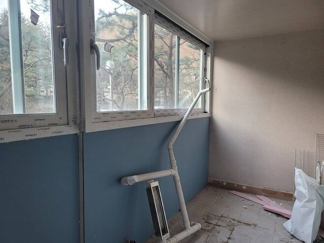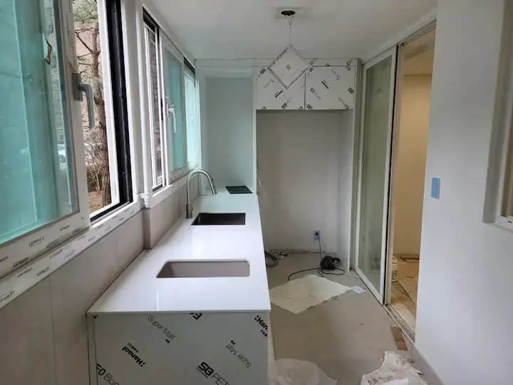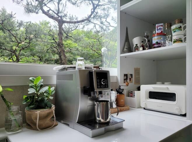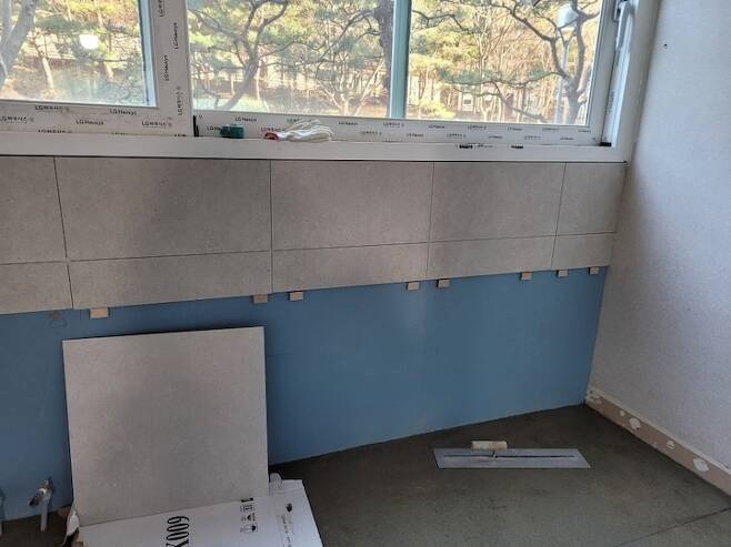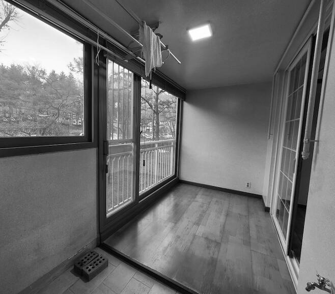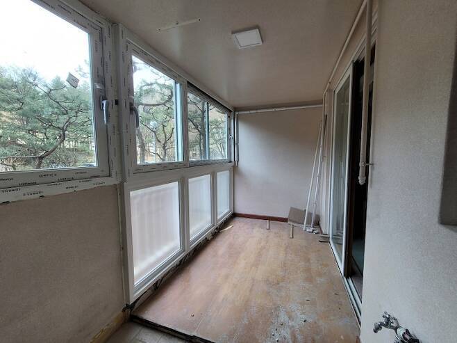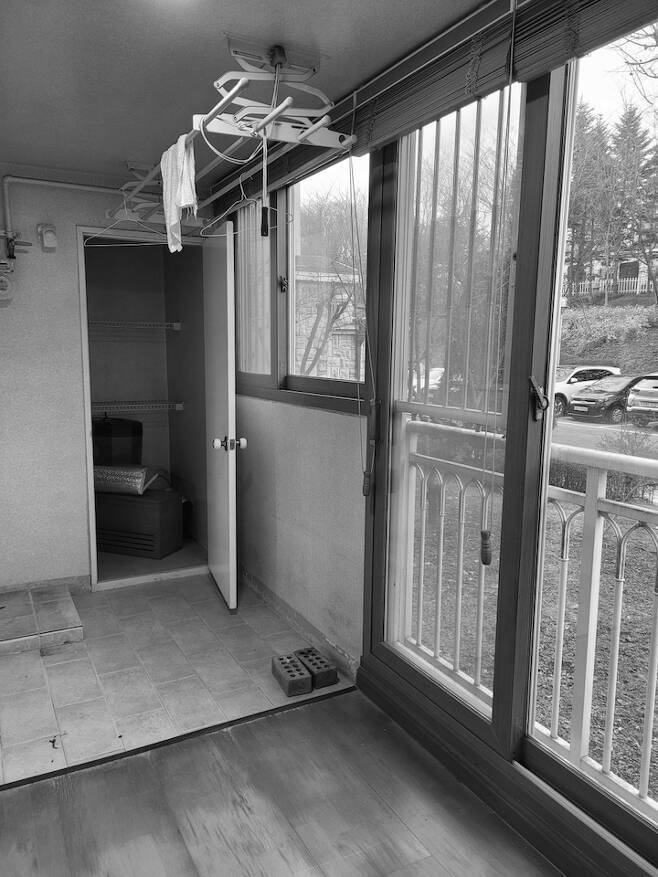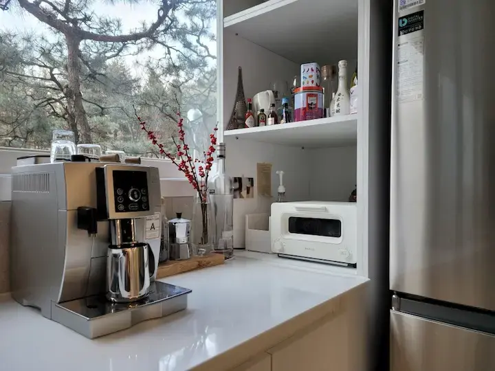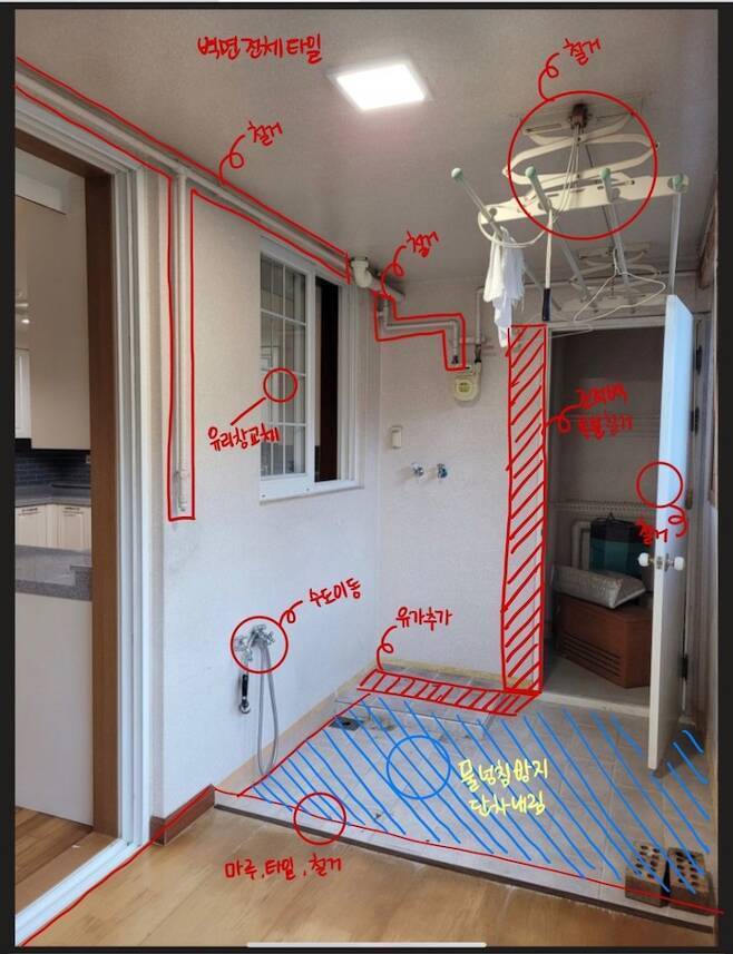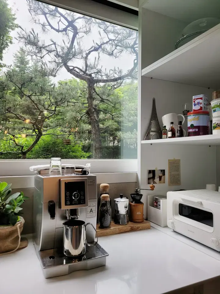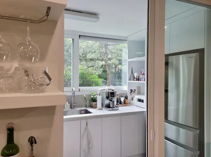 안녕하세요. 3대가 함께 살아가고 있는 인아웃홈입니다 :) | 대식구가 사는 집, 보조주방을 만들기로 하다 오늘 이야기할 베란다 인테리어는 도면의 '발코니4'로 주방 옆 다용도실 겸 베란다예요. 이 베란다의 폭이 가장 넓어서 어떤 공간으로 활용을 할까 많은 상상을 하기도 했지만 역시나 현실 세계의 공간으로 밖에 안되겠더라는...ㅎㅎ 그래서 세탁실 겸 보조주방을 만들기로 정했어요. (베란다 로망이 컸던 저는 사실 삼겹살 파티를 할 수 있는 공간으로 만들고 싶었어요...ㅋㅋㅋ 캠핑존 같은 ㅋㅋ) 그래서 리모델링 시 가장 중점적으로 생각한 부분은 아래와 같습니다. 📌 베란다 인테리어_ 보조주방 만들기 1. 대식구의 주방 살림 및 식재료를 보관할 수 있는 팬트리의 역할 필요 2. 세탁기 2대와 건조기, 김치냉장고 넣을 공간 필요 3. 홈카페 느낌 필요 ㅋㅋ 4. 싱크볼 가스레인지 둘 다 있는 보조주방 만들기 | 베란다 보조주방 Before / After 이렇게 해서 보조주방으로 변신한 베란다의 모습! 이쪽 창가 뷰가 너무 좋아요 ㅠㅠ 비오는 날 눈 오는 날 다이닝룸에서 커피 한잔하면서 보조주방 창가를 보고 있으면 진짜 힐링 ㅜㅜ 보조주방의 작은 한편에 자리 잡은 홈카페! 창가의 소나무 뷰와 함께하니 더 좋음! 📌 시작 전에 잠깐! 꼭 알아야 할 주의사항발코니 '우수관'에는 세탁기나 싱크대 사용을 할 수 없다는 사실! '우수관'은 물이 그대로 흐르기 때문에 여기에 싱크대 배관을 연결하면 안 돼요. 반면 정화 시스템을 통해 방류되는 '오수관'에는 연결이 가능해요. 저는 기존 발코니가 세탁실로 사용하는 공간이었고, 세탁실 오수를 배출하는 오수관에 싱크대 배관을 연결해서 오수를 배출하도록 공사했어요. 이렇게 설치되어야 문제가 없답니다. 발코니 보조주방 시공 전에 '내가 보조주방을 만들려고 하는 발코니에 우수관이 있는지, 오수관이 있는지' 꼭 미리 체크하세요. 아파트 관리사무소나 구청에 문의하면 아실 수 있습니다! | 베란다 보조주방 만드는 과정 1. 덩치 큰 가전 위치 정하기 베란다 레이아웃 베란다 보조주방 공사 항목 보조주방을 만들기에 앞서 일단 세탁기 2대와 건조기, 김치냉장고 자리부터 정했어요. 도면에 창고라고 표시되어 있는 곳에 원래 다양한 짐을 넣는 공간으로 사용했던 것 같은데 저희는 창고 문과 옆에 조적벽을 부분 철거해서 공간을 만들어 세탁기와 건조기를 넣었어요. 원래 싱크대 자리 쪽에 세탁기와 건조기를 나란히 옆으로 넣을까 생각도 해봤는데 엄마는 둘 다 아래에 있으면 허리가 아프다고 하셔서 그냥 수직으로 두기로 했는데 수납을 하기에도 지금 계획이 더 나아 보였어요. 비포 애프터 2. 셀프페인팅하기 베란다 벽면은 전체 셀프 페인팅으로 조금 더 깔끔하게 바꿔줬는데... 이맘때가 거의 막바지여서 너무 힘들었나 봐요... 사진이 없네요...ㅋㅋㅋ 📌 페인트 정보벤자민 무어 OC-117 Simply White 세탁기 자리 옆에도 목공 작업으로 틈새 수납을 좀 할 걸 아쉬움이 남아요. (인테리어 일정이 짧아서 할 수도 없었지만ㅎㅎ) 여기서 잠깐! 세탁실 깔끔하게 정리하는 꿀팁을 알려드릴게요! 3. 콘센트 매립하기 바로 대기전력 콘센트 매립하기! 예전에 살던 곳도 그렇고 여태껏 살면서 세탁실은 항상 멀티탭만 사용해왔던 저는 이번에 리모델링하면서 대기전력 콘센트가 따로 있다는 걸 처음 알게 되었어요. 치렁치렁 멀티탭을 사용하지 않고 리모델링 시에 스위치 콘센트를 매립하면 미관상 훨씬 깔끔하고 편리해요! 진짜 좋습니다 :) 스위치는 나노 브랜드 [스위치 부착 콘센트] 라는 제품명으로 판매가 되고 있어요. 스위치는 르그랑/나노 이렇게 사용했는데 요즘 나노 스위치는 조금 더 예뻐졌어요. 저희 집 스위치는 구형이고 신형 스위치를 검색하면 가격도 디자인도 훨씬 좋아졌어요! 4. 샷시 단열 후 싱크대 위치 정하기 베란다 보조주방 인테리어 셀프 도면이에요. 세탁실을 결정하고 보조주방 쪽으로 넘어와 고민한 부분은 아무래도 싱크대의 위치, 수납, 사이즈였어요. 수납도 많이 해야 하고 그렇다고 너무 또 답답해 보여서는 안되고 어느 쪽에 놔야 실용적일까? 고민을 많이했는데 결론은 샷시 쪽을 단열해서 싱크대를 놓기로 했어요. 이 결정이 베란다 보조주방 인테리어의 신의 한 수가 아닐까 싶어요. 기존의 풀샷시는 1층의 프라이버시에 아무런 도움을 못 주었고 단열에도 취약했기에 ㅎ 하단을 픽스창에 단열을 하고 싱크대를 주니 단열과 프라이버시도 동시에 해결되고 창가 쪽 소나무 뷰를 더 돋보이게 하여 홈 카페도 만들 수 있었어요. 일석삼조 ㅎㅎ 세탁실 옆으로는 창문이 있었고 오른쪽으로는 풀샷시여서 창문 높이로 픽스창을 맞춰 더 깔끔해졌어요! 기존의 베란다 풀 샷시창 (저희 집이 훤~~이 다 보이겠어요ㅎ) 베란다 보조주방 인테리어 픽스창 샷시 교체 (샷시를 교체하면서 아랫부분을 픽스창으로 고정) 베란다 보조주방 인테리어 단열작업 (베란다 샷시 교체하고 아랫부분 단열작업) 베란다 보조주방 인테리어 타일 시공 (베란다 바닥 타일과 벽면 타일을 통일했어요.) 📌 타일 정보윤홍타일 (벽면 Y3655 300*600, 바닥 Y6055 600*600) 5. 싱크대 설치하기 메인 