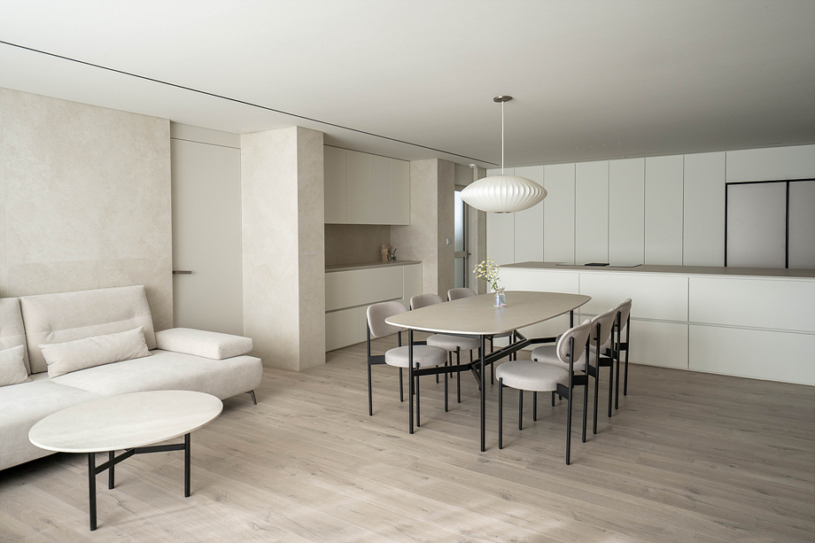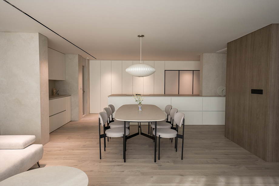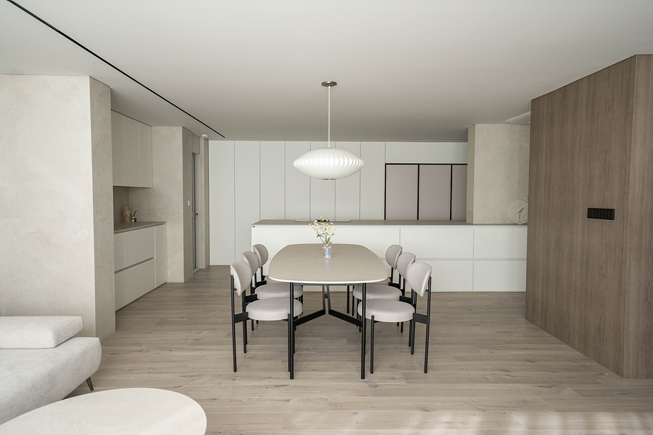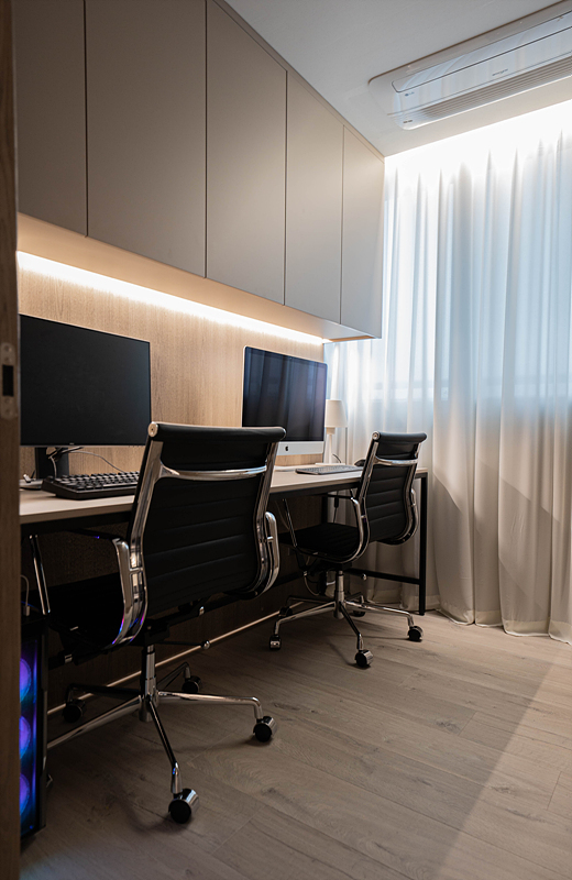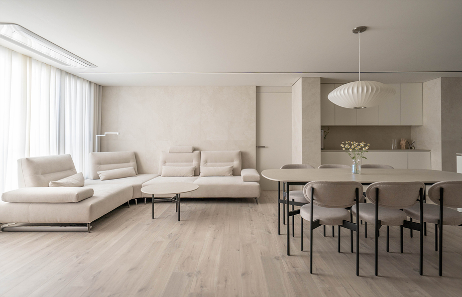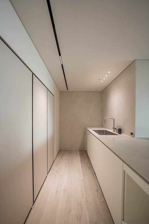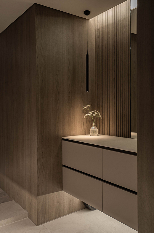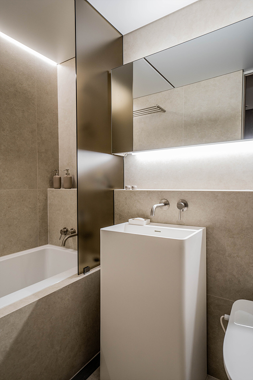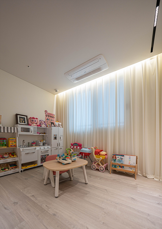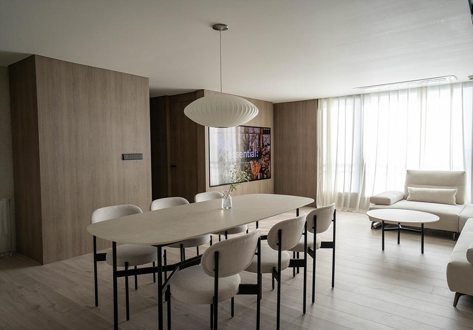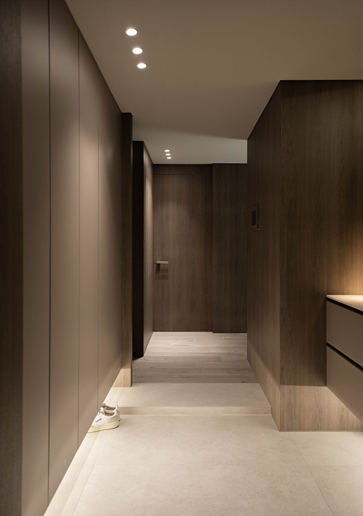 그레이지(Greige) 컬러에 대해 들어보셨나요? 그레이(Gray)와 베이지(Beige)의 합성어로, 회색과 베이지의 중간색을 의미합니다. 세계적인 색채기업 팬톤에서 지난 2019년 하반기 인테리어에 활용할 트렌드 컬러로 ‘그레이지’를 선정한 이후로도, 꾸준하게 많은 사랑을 받아온 ‘뉴트럴’ 컬러의 일종이기도 하죠. 베이지의 따뜻함과 그레이의 모던함이라는 두가지 장점을 모두 갖추고 있어, 내추럴한 무드로 포근하면서도 우아한 느낌을 손쉽게 연출할 수 있습니다. 이번 스토리에서는 차분하고 은은한 느낌의 그레이지 색감을 메인컬러로 사용해 따뜻한 분위기와 한층 더 고급스러운 느낌의 톤앤매너를 완성한 35평형 공동주택(APT) 홈스타일링 사례를 소개합니다. 특히 천연 원목마루와 같은 질감과 디테일을 가진 ‘퀵스텝 하이브리드 마루’로 집안 전체 바닥을 마감해 모던하고 세련된 스타일을 완성했습니다. 아울러 최근 인테리어계에서 큰 영향력을 미친 ‘인쇼스타일’ 대면형 주방으로 스타일링한 주방 모습도 함께 담았습니다. HOUSE PLAN 위치 경기도 시흥시 배곧신도시 규모 114㎡ (35평) 규모의 방 3개, 욕실2개 공사기간 45일 디자인 포인트 그레이지 색감을 활용한 톤앤매너 인테리어, 무문선·무몰딩(문선과 몰딩이 없는 디자인) 등 최대한 군더더기 없이 깔끔한 레이아웃을 연출한 인테리어쇼(인쇼)**스타일 홈스타일링, 주방과 거실의 레이아웃을 변형시킨 대면형 ABC 아일랜드 주방 디자인, 마그네틱 조명과 간접 조명을 적극 활용한 감각적인 디자인 주요마감내역 공통 벽-인테리어 필름 시공, 타일, 도장 / 천정-도배 / 바닥-벨기에산 친환경 퀵스텝 하이브리드마루* (IM1854 (Soft Oak Light) + Wacker T3000 본드) / 융스위치, 마그네틱 조명, 2인치&1.5인치 다운라이트 현관/복도 센서 간접등, 스텝도어 마감시공 거실 86인치 TV매립, 측면 간접등 주방 대면형 아일랜드 PET, 세라믹상판, 빌트인가전(LG), 니콜라 테슬라 인덕션&후드 욕실 포세린타일, 니켈 휴지걸이, 수건걸이, 더죤테크 매립수전, 욕조제작, 졸리컷시공 *퀵스텝 하이브리드 마루란? : 열과 수분에 의한 변형을 최소화하는 클릭시스템과 표면강도를 10배 이상 강화시킨 첨단오버레이 기술을 적용하고 특수 프레스공법으로 100% 방수 기능을 구현한 친환경 마루 **인쇼스타일이란? : 인테리어 리모델링 디자인 전문 유튜브채널 ‘인테리어쇼’에서 선보인 미니멀 디자인에 특화된 디자인컨셉 및 시공방식을 의미. 주요 특징으로는 1)몰딩 없고(무몰딩) 문선 없는(무문선) 히든도어 등 최대한 깔끔한 레이아웃을 지향 2)벽 또는 천정에 매립한 라인간접조명을 통한 분위기 연출, 3)넓고 탁트인 거실대면형 아일랜드 주방인테리어 적용, 4) 화이트톤 인테리어 자재 사용, 5) 그외 조명과 구조를 절묘하게 설계한 세련된 디자인 등 무게감있는 월넛과 은은한 베이지가 조화를 이루는 현관 월넛 컬러와 베이지가 완벽한 조합을 이루는 현관입니다. 나뭇결이 살아있는 다크 월넛 색상의 인테리어 필름 시공으로 적당한 무게감과 편안함을 잡아주고, 베이지 톤의 타일을 사용해 은은하고 아늑한 느낌을 더해주었습니다. 슬림한 팬던트 조명과 센서 간접등을 다양하게 활용해 감각적인 무드를 연출하였습니다. 또 단순히 신발장만 배치되는 공간이 아니라, 파우더룸 같은 느낌의 가구와 소품으로도 채워 집에 들어올 때마다 현관을 좀더 특별한 공간으로 느낄 수 있도록 디자인했습니다. 복도에는 스텝도어 방식으로 시공했습니다. 스텝도어는 헤더(인방)과 측면 문틀(도어)까지 벽체보다 돌출되지 않도록 한 뎁스(depth) 안쪽으로 밀어넣어 작업해 시각적으로 문 손잡이 부분이 튀어나오지 않도록 하는 마감처리하는 방식으로, 완결성을 갖추고 풍성한 공간감까지 형성해줍니다. 복도를 따라오면 바로 보이는 거실과 주방의 모습입니다. 현관, 복도 도입부까지 깊고 짙은 월넛 컬러로 공간에 무게감을 주다가, 복도를 지나 만나는 메인공간은 그레이지 컬러를 사용해 전이공간(한 공간을 지나 다음 공간으로 이동할 때 경험하는, 연출된 과정의 공간)의 느낌을 선사합니다. 밝기와 농도의 색상대비를 준 ‘톤온톤 인테리어’로 더 밝고 사랑스러운 분위기를 더했습니다. 그레이지 컬러로 완성한 고급스러운 주방인테리어 그레이지 색감을 메인 컬러로 사용한 세련된 무드의 주방 인테리어입니다. 차분하고 은은한 느낌의 ‘그레이지’는 화이트나 아이보리에 비해 한층 더 우아한 분위기를 더해주며, 포근한 감성과 정돈된 느낌을 줄 수 있습니다. 채도가 많이 빠진 그레이지 컬러에, 색감이 또렷하고 짙은 우드 계열의 가구, 마감재, 소품 등을 함께 사용한다면 클래식하면서도 세련된 분위기를 연출할 수 있습니다. 개방감 있는 레이아웃으로 구성해 거실 쪽을 바라보고 요리를 할 수 있고, 가족들과 함께 소통하기에 좋은 편리한 동선을 만들었습니다. 분위기 있는 홈바(Bar)를 만들어 파티를 즐길 수 있을 만큼 여유있는 다이닝 공간으로 활용할 수 있습니다. 주방과 거실공간이 보다 더 넓어보이는 디자인을 위해 주방과 거실의 레이아웃을 변형시키고, 인쇼스타일(인테리어쇼 스