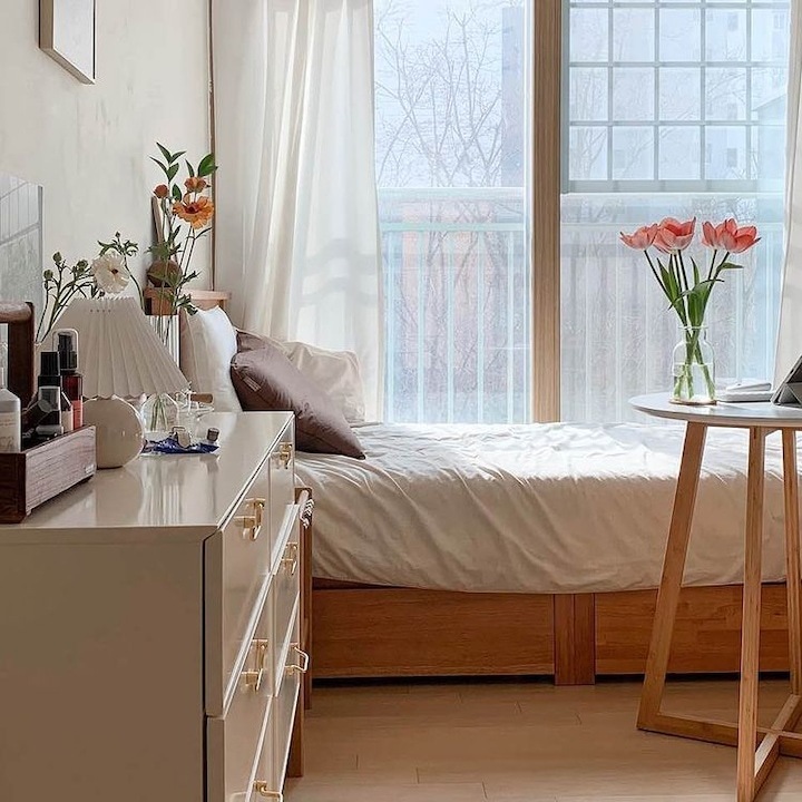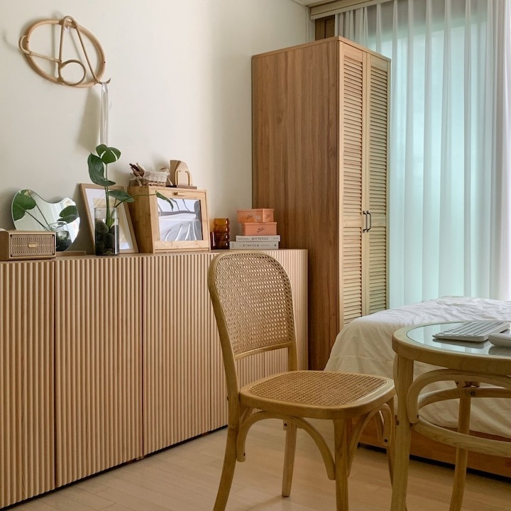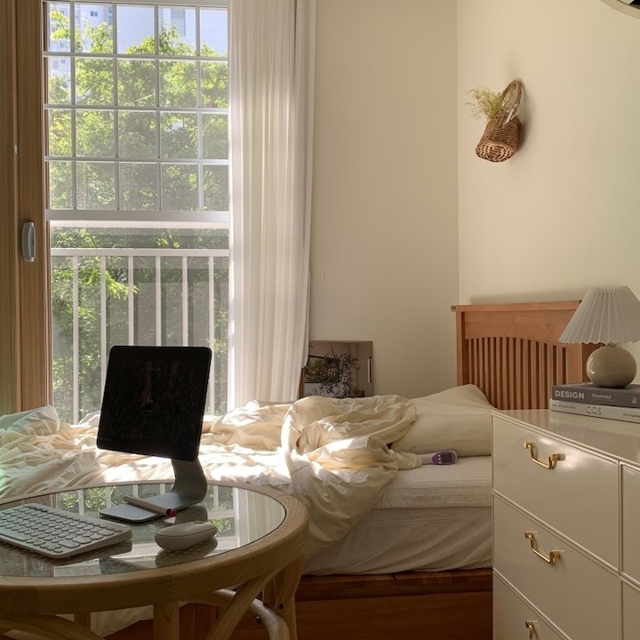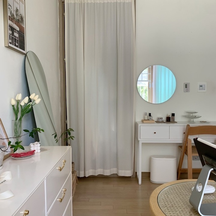 저는 일 년에 한 번에서 두 번 정도 가구 배치를 하면서 인테리어에 변화를 주는 편이에요. 같은 방, 같은 가구지만 어떻게 배치하냐에 따라 새로운 분위기 연출이 가능하잖아요. 분위기도 분위기지만 가구 배치에 따라서 공간 활용도 정말 다양하게 활용할 수 있어요. 이렇게 몇 년 동안 꾸준히 가구를 재배치하다 보니 이제는 옷장, 침대 하나쯤은 정말 거뜬히 위치를 옮길 수 있지 뭐예요🤣 이번에는 3차에 걸친 가구 이동이 있었는데 그 변화 과정을 써보려고 해요. > 1차 가구 배치 작년 겨울 감자룸의 모습이랍니다. 침대 헤드가 창가 쪽으로 향해 있었고 문을 사이에 두고 양옆으로 화장대와 서랍장 침대 반대편은 긴 옷장과 옷걸이, 선반 등이 위치했었어요. > 2차 가구 배치 전 구조와 비교하기 쉽도록 간단하게 배치도를 그려봤답니다. 옷장과 벽 행거는 그대로 놔두고 침대 방향을 바꿔줬어요. 침대가 세로로 배치돼 있을 때는 서랍장과 문 사이의 간격이 좁았어요. 올해는 침대를 가로로 위치를 변경하니까 서랍장을 훨씬 여유롭게 배치할 수 있었어요. 대신 옷장과 침대 간격이 좁아졌죠ㅠㅠ 그래도 옷장을 열고 닫는 데는 전혀 문제가 없는 거리였기 때문에 크게 신경 쓰이는 부분은 아니었어요. 침대의 방향만 바꿔줬을 뿐인데 방이 더 넓어 보이고, 좀 더 안정감이 느껴지지 않나요? > 3차 가구 배치 그리고 얼마 전, 가을맞이 가구배치를 다시 시도했어요. 신박한 가구배치를 원했지만 아무래도 큰 옷장과 벽 행거 때문에 한계가 있었어요. 고민 끝에 벽 행거에 걸려있던 옷들은 서랍장과 수납장, 붙박이장에 차곡차곡 잘 정리해서 수납해버리고 벽 행거를 과감하게 떼버렸어요. 그리고 서로 반대로 가구를 이동했죠. 바로 위 사진이랑 비교하니 차이점이 좀 보이시나요? 제 방의 창문이 한쪽 벽으로 쏠려있는 구도라 옷장과 침대를 서로 반대로 바꿔주기만 해도 이렇게 분위기가 확 달라지더라고요. 그리고 구조를 바꾸고 보니 매일 같은 자리에 비추던 햇살도 조금 다른 분위기로 비치더라구요?ㅎㅎ 전 구조에서는 찍을 수 없었던 새로운 구도로 사진을 찍어봤어요. 이 구도로 찍어보니 제 방의 전체적인 모습이 훨씬 더 자세하게 찍히는 것 같아요😁 위치를 서로 반대로만 바꿨는데도 이렇게 분위기가 크게 달라졌어요. 사실 전 구도가 너무 맘에 들어서 가구 이동을 망설였었는데 막상 바꾸고 나니까 금방 적응해버렸어요ㅋㅋ 아무래도 저는 제 방만 홈스타일링을 하다 보니 다양한 콘텐츠를 만들기가 좀 쉽지 않아요ㅠㅠ 그래서 이렇게 자주 구도에 변화를 주고, 소품을 이용하면서 제가 할 수 있는 선에서 열심히 제 공간을 가꾸고 있답니다. 감자룸의 가구배치 끝까지 읽어주셔서 감사해요 :) |
