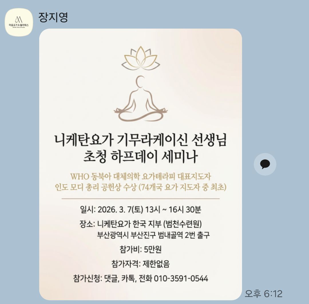 세계보건기구(WHO)의 동북아(韓中日) 대체의학 요가테라피의 대표지도자이자, 인도의 모디 총리로부터 74개국 요가 지도자 중에서 처음으로 공헌상을 수상한 기무라케이신 선생님의 하프데이 세미나를 아래와 같이 개최하오니, 많은 참석 바랍니다.