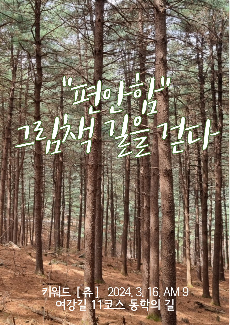[여주] 3/16(토) 주록리 그림책 길을 걷다 - 키워드 ‘츄‘ 작성자머뭇|작성시간24.03.08|조회수206 목록 댓글 3 글자크기 작게가 글자크기 크게가 3월 여주 그림책 길은 “편안힘” 그림책 길입니다. 여강길 11코스 주록리 길을 걷고 ‘츄’ 그림책 나눔을 합니다. 문의 : 머뭇(010-8380-6975) 다음검색 현재 게시글 추가 기능 열기 북마크 공유하기 신고 센터로 신고 댓글 댓글 3 댓글쓰기 답글쓰기 댓글 리스트 작성자뚜셰 | 작성시간 24.03.11 키워드 우? 로요? 답댓글 작성자머뭇 작성자 본인 여부 작성자 | 작성시간 24.03.15 츄! 수정했어요 답댓글 작성자뚜셰 | 작성시간 24.03.15 머뭇 ㅎㅎ 댓글 전체보기
