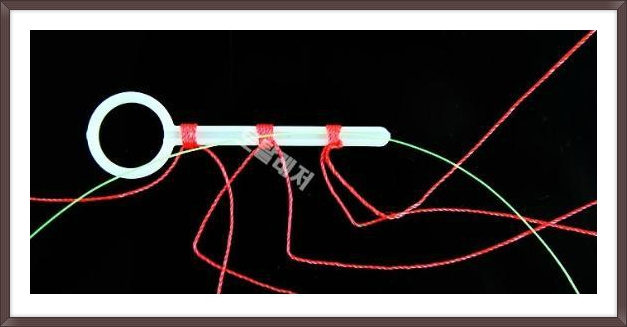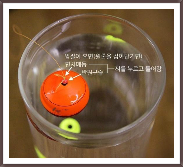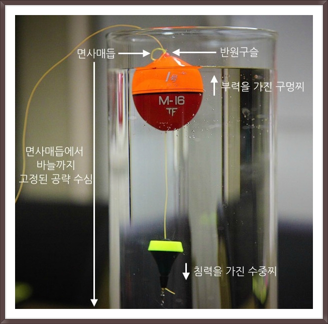 여기서 면사매듭과 반원(반달)구슬의 역활이 매우 큰데요, 면사매듭과 반원(반달)구슬이 찌를 누르고 수면아래로 들어가기