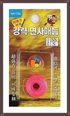 실제 크기입니다. 아래의 보이는 핑크색 실타래를 풀어서 낚시줄에 자신이 매듭을 하여 사용 합니다.