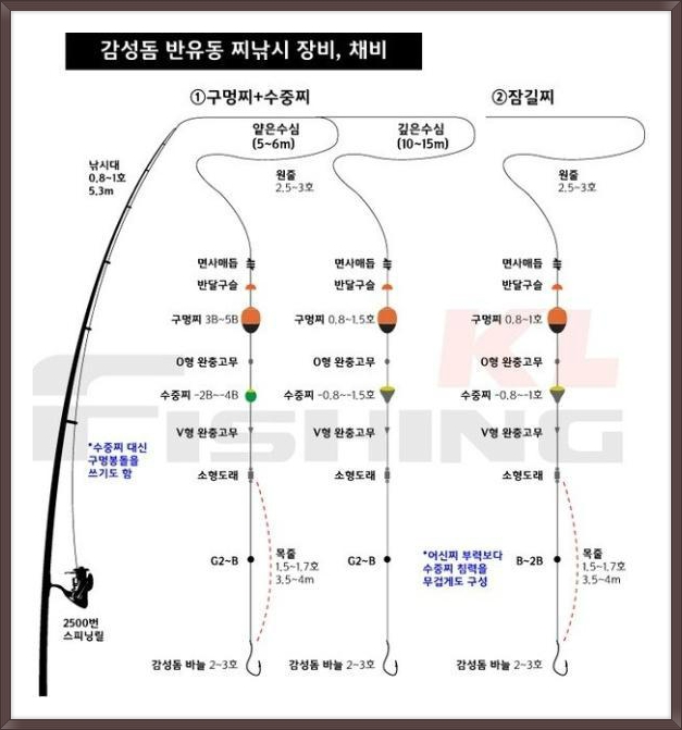 릴 찌낚시에는 반유동 채비법과 전유동 채비법으로 크게 2가지로 나누어 집니다.