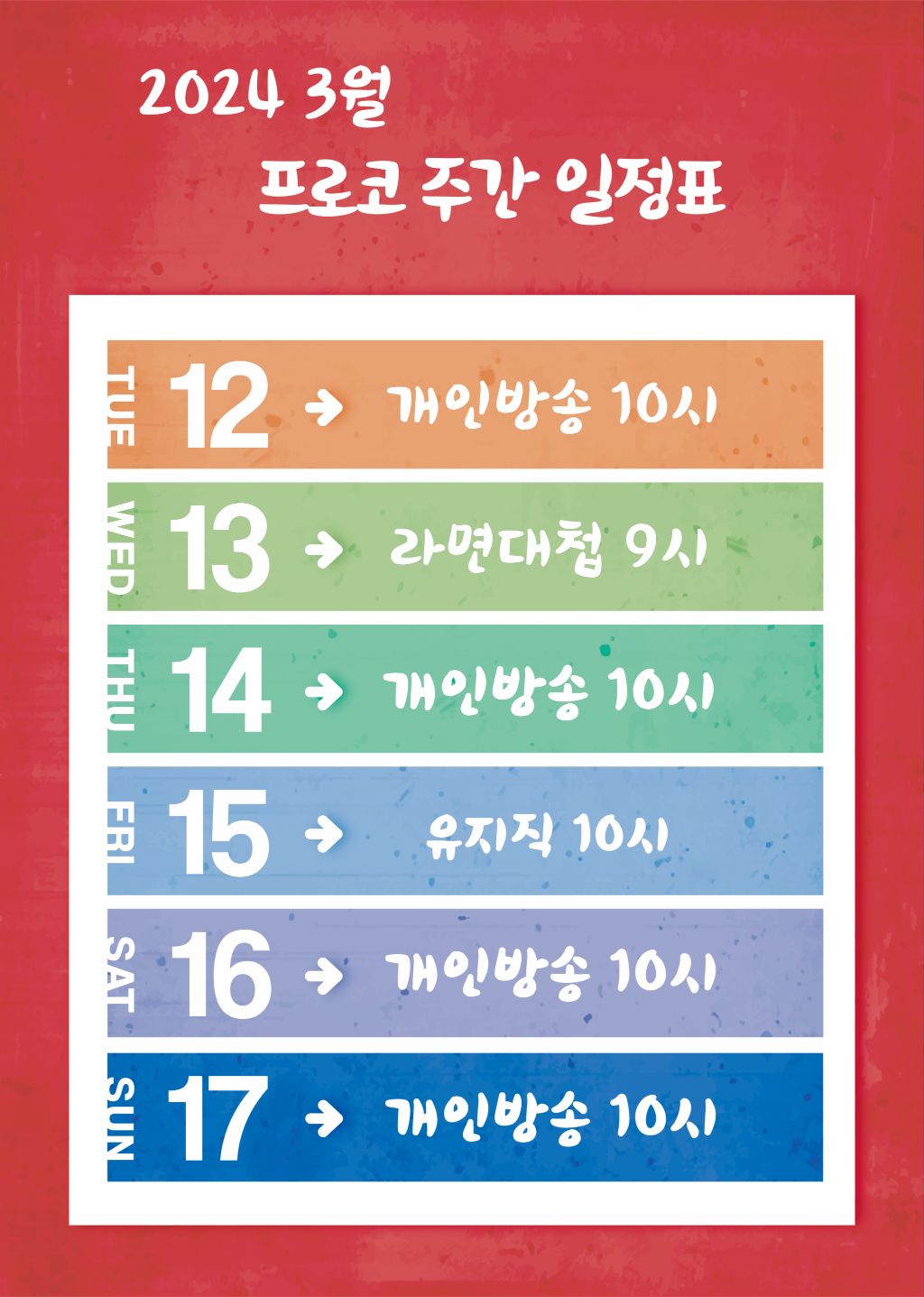 프로코3월2째주 스케줄 작성자[P]프쫑긋|작성시간24.03.12|조회수9 목록 댓글 0 글자크기 작게가 글자크기 크게가 다음검색 현재 게시글 추가 기능 열기 북마크 공유하기 신고 센터로 신고 댓글 댓글 0 댓글쓰기 답글쓰기 댓글 리스트