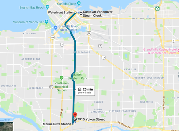 밴쿠버 민박은 위에도 말씀드렸다시피 마린 드라이브 스테이션 근처에 위치하고 있어요. 걸어서 5분 거리! 주소는 '7915 Yukon St.'입니다.