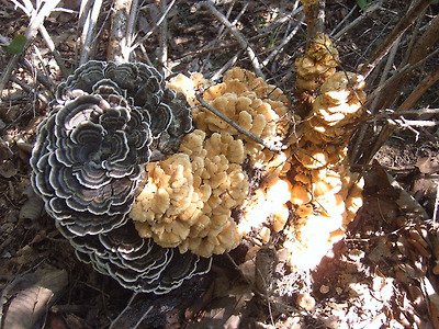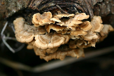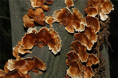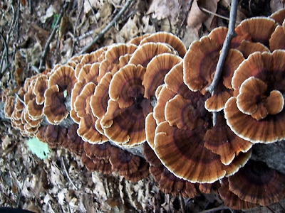 갈색꽃구름버섯이 운지의 형태로 층층히 뭉쳐난 모습