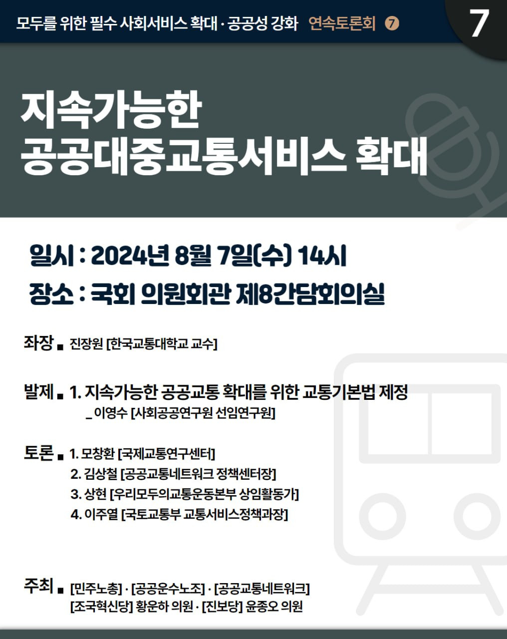 [공지] 민주노총 공공성 강화 연속토론회 <교통분야> 지속가능한 공공대중교통서비스 확대 작성자조경옥|작성시간24.07.30|조회수48 목록 댓글 0 글자크기 작게가 글자크기 크게가 다음검색 현재 게시글 추가 기능 열기 북마크 공유하기 신고 센터로 신고 댓글 댓글 0 댓글쓰기 답글쓰기 댓글 리스트