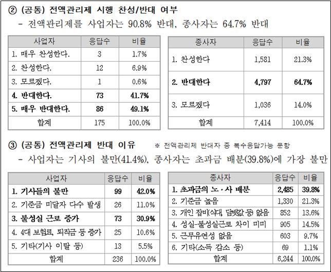 앞서 모 보좌관에게서 확인한 ‘택시기사들도 완전월급제를 반대한다’는 논리는 완전월급제 전국 시행이 유예되는 과정에서 강력한 근거로 활용됐다. 이러한 주장은 서울시에서 실시한 ‘전액관리제 시행 실태조사’에 근거한다.