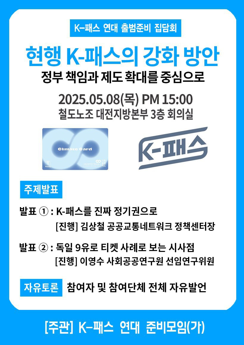 [공지] (가)K-패스 연대 출범 준비 집담회 개최 작성자조경옥|작성시간25.04.22|조회수47 목록 댓글 0 글자크기 작게가 글자크기 크게가 공문_K-패스연대_2025_01호_K-패스연대출범준비집담회참여요청.hwp202.50KB 첨부파일첨부된 파일이 2개 있습니다. jpg 파일 250508_K-패스연대출범준비집담회웹자보.jpg 다운로드 hwp 파일 공문_K-패스연대_2025_01호_K-패스연대출범준비집담회참여요청.hwp 다운로드 다음검색 현재 게시글 추가 기능 열기 북마크 공유하기 신고 센터로 신고 댓글 댓글 0 댓글쓰기 답글쓰기 댓글 리스트